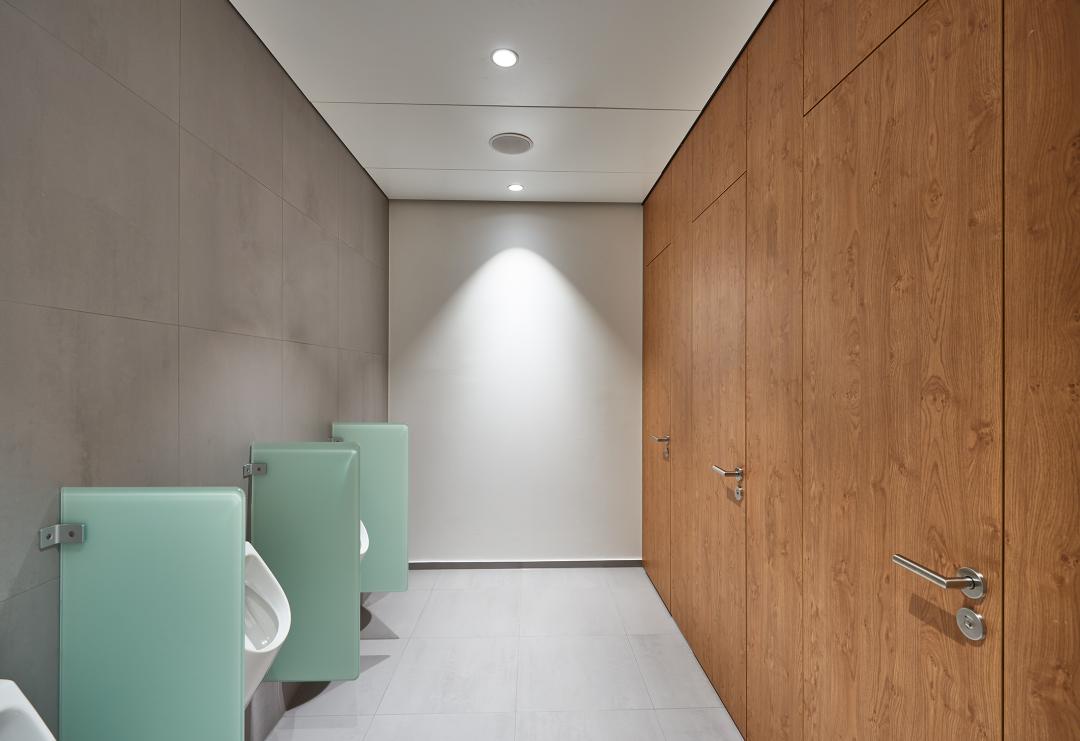 Le système de cabine Schaefer de type SVF30 en panneau d'aggloméré laminé massif avec pièces latérales ABS de couleur contrastante. L'alternative lorsque l'on accorde de l'importance à la forme en plus de la pure fonctionnalité ! Ce système uni fait impression grâce à sa face avant lisse et reposante. Un nettoyage rapide des parois, une protection latérale efficace et une forme aux lignes sympathiques sont autant d'arguments qui plaident en faveur de ce type de cloison de séparation.