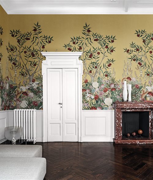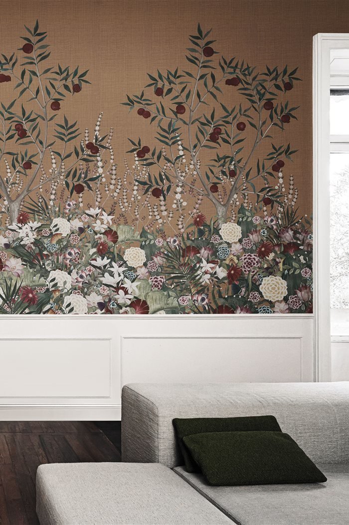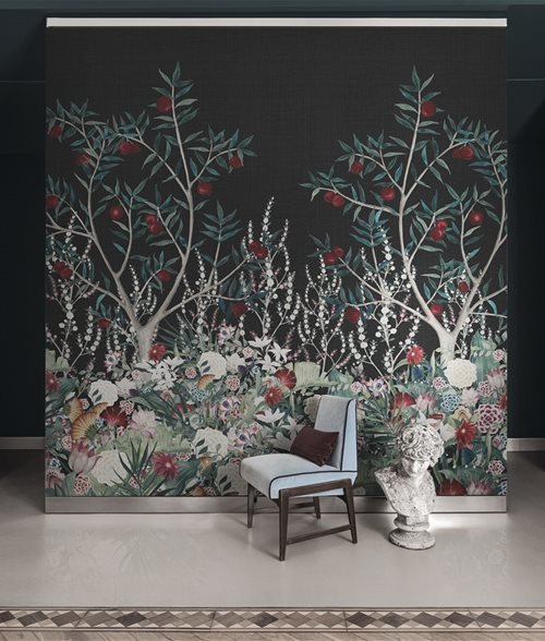 Une émeute de fleurs et d'arbustes aux lignes élégantes dans un équilibre parfait entre l'abondance de feuilles, de fleurs et de fruits magnifiquement formés sur des branches grimpantes pleines de vie. Dans ce papier peint, les couleurs vives s'assoccent et donnent une aura presque magique.