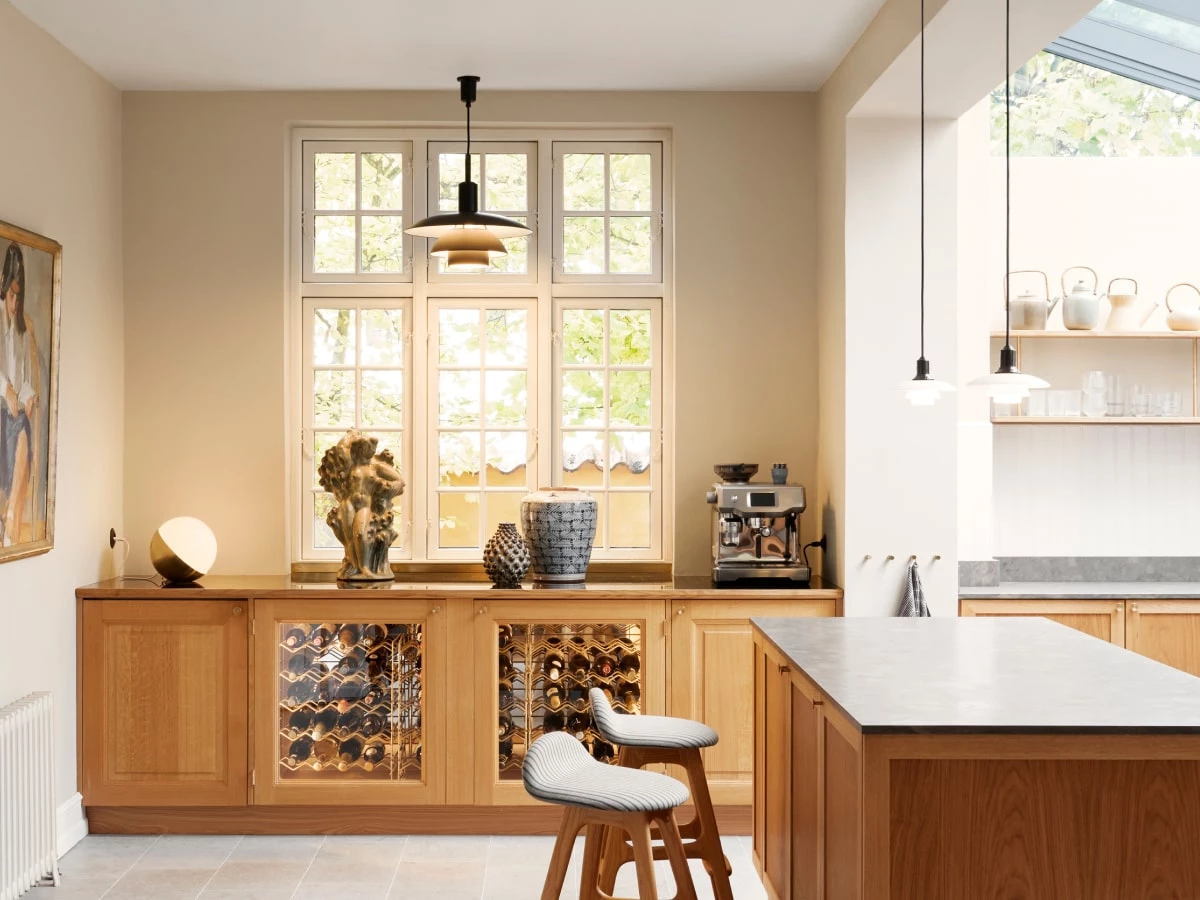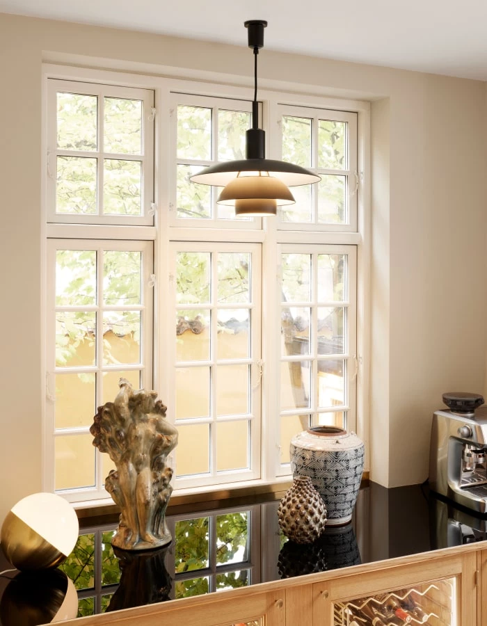 Poul Henningsen a conçu des centaines de lampes basées sur son ensemble abat-jour mis au point en 1926. Ce dernier permet une qualité d’éclairage inégalée pour tous les besoins. Une grande partie de ses modèles de lampe incluent un nombre dans leur nom qui fait référence à la taille de leurs abat-jour. Le modèle PH 5/5 est décrit comme une suspension aux proportions « idéales », caractérisée par son aspect compact et séduisant avec un abat-jour supérieur d’environ 50 cm, et des abat-jour intermédiaire et inférieur respectant les proportions de 3:2:1.