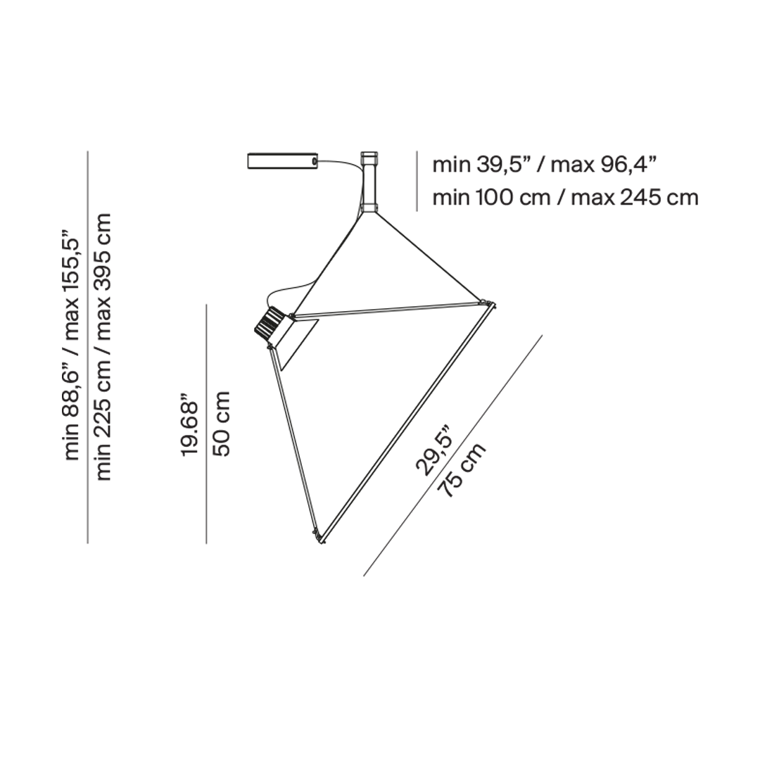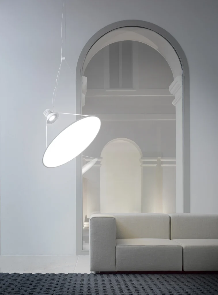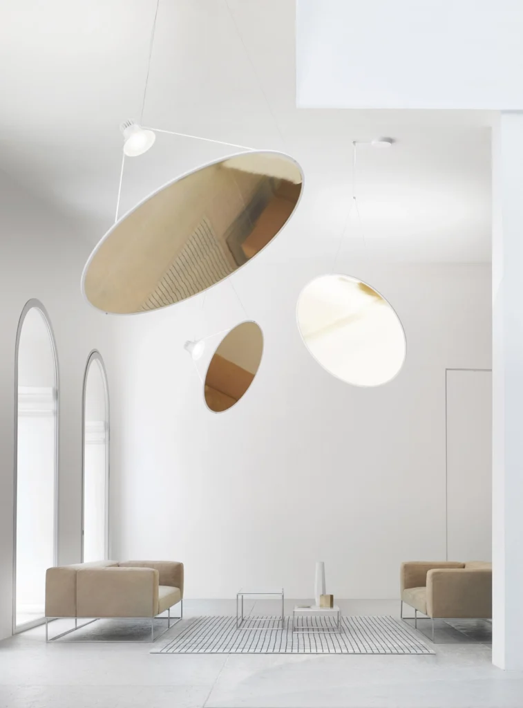Amisol est une suspension qui occupe un grand espace physique avec un volume physique minimal, pour une orientation facile dans l’espace. Un film blanc translucide ou une membrane miroir métallisée est étiré à l’intérieur d’un profilé circulaire en aluminium. Comme une voile solaire, une source lumineuse incroyablement puissante projette un faisceau de lumière sur le grand disque presque en apesanteur, diffusant ou réfléchissant la lumière.