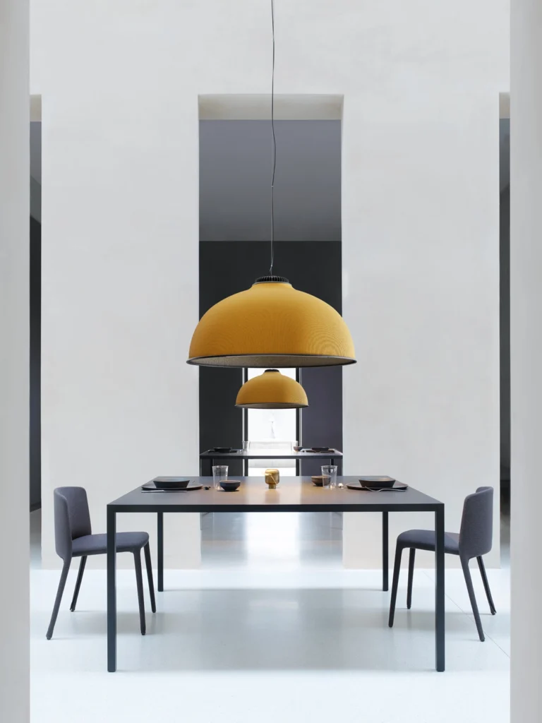Farel introduit pour la première fois dans le catalogue Luceplan, une structure de dôme emblématique, une forme géométrique neutre proposée en matériau thermoformé insonorisant avec revêtement extérieur en tissu. La lampe peut être personnalisée grâce à une combinaison de couleurs de l’abat-jour, allant des tons froids, chauds et neutres pour l’extérieur, combinés à des teintes sombres ou pâles pour l’intérieur.