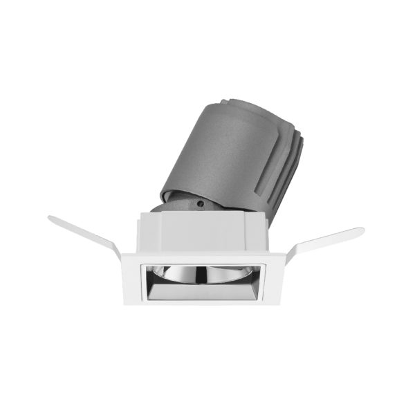Spot encastré carré orientable, avec ou sans bordure. Angle d'inclinaison 30° et angle de rotation 350° avec angle de faisceau disponible en 20°, 30° et 40°. Installation facile par clip et connecteur sans outil.