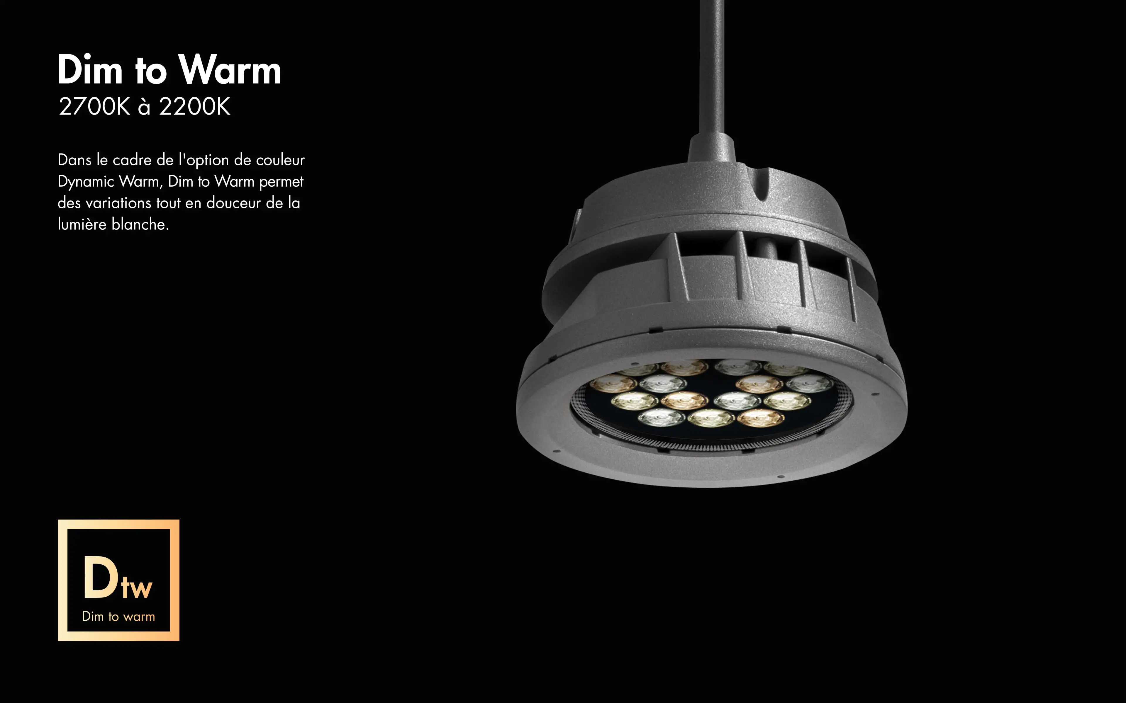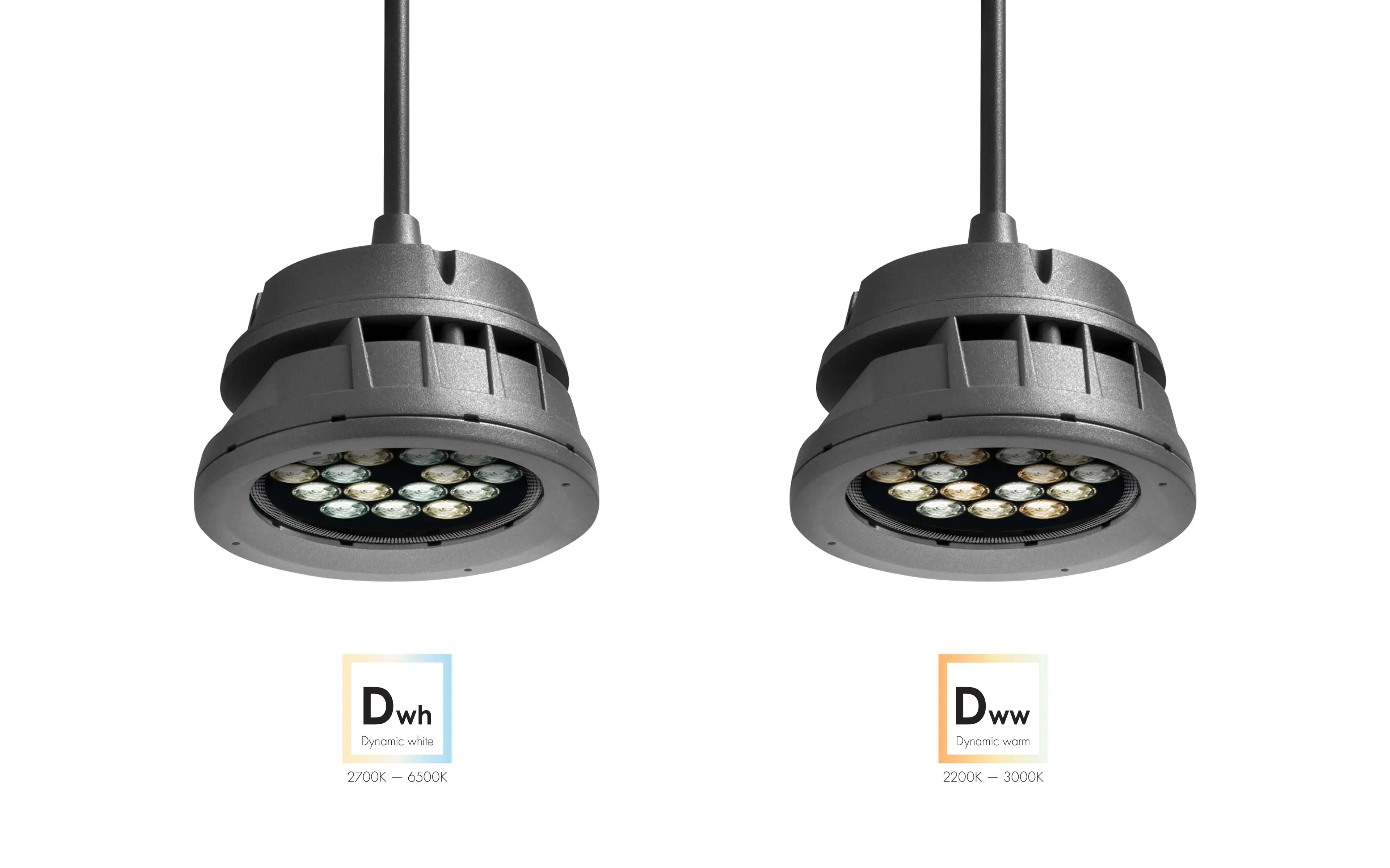 Le Lumenbeam Medium Pendant Blanc Dynamique est un luminaire suspendu IP66 pour les applications à haut plafond comme les terminaux d'aéroport et les atriums publics. Il présente la technologie permettant de sélectionner la température de couleur de votre choix, dans le spectre de 2200K à 3000K ou de 2700K à 6500K. Cette fonctionnalité dynamique donne aux concepteurs et à leurs clients la liberté de modifier l'ambiance d'un espace en fonction de l'heure de la journée ou de la façon dont un espace est utilisé. Muni de nombreuses options, il offre des optiques d'éclairage de projection et d'accentuation, de multiples options de contrôle ainsi que divers accessoires permettant une intégration parfaite au projet.