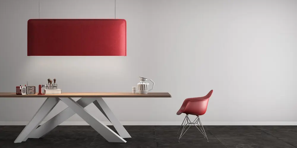 Panneaux insonorisants en fibre multi-densité , de forme rectangulaire , avec câbles de plafond réglables pour un positionnement vertical ou horizontal.