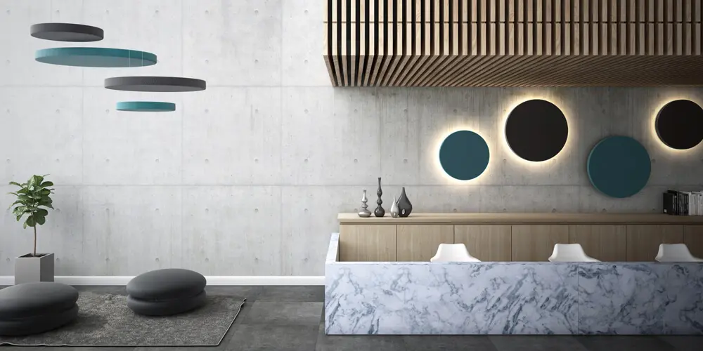 Personnalisable en couleurs et en dimensions , le panneau Melodia de forme circulaire offre également une large gamme d' options de fixation, aussi bien au mur qu'à plafond.