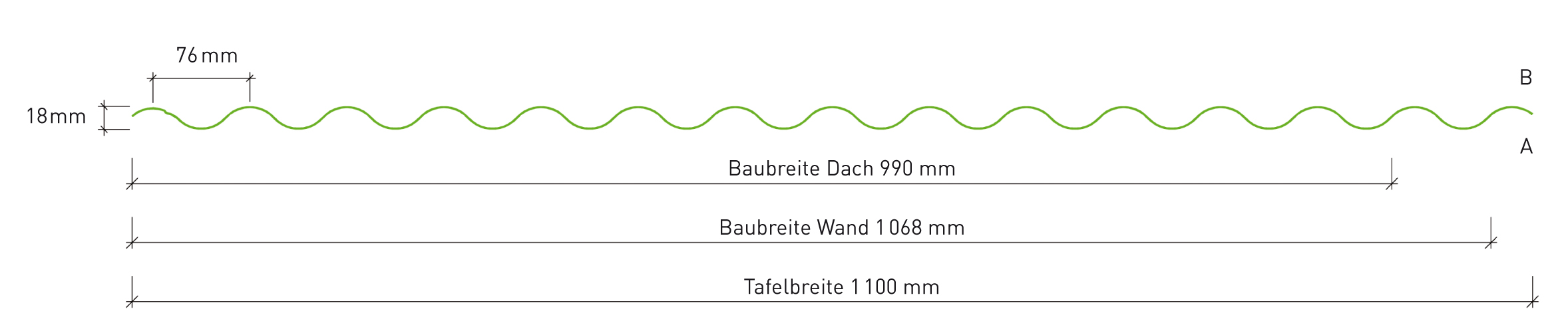 Le produit Toiture en tôle ondulée 18-76 du fabicant MAAS Profilé a une largeur de 1100 mm,