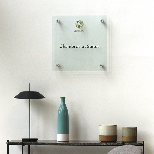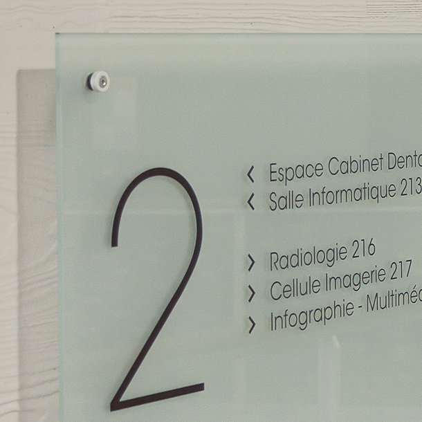 Les supports signalétiques Glasskit© Marcal sont fabriqués en verre trempé de 8 mm d'épaisseur, monté sur des entretoises en aluminium ou inox, offrant des solutions pour des plaques de porte, pictogrammes, balises directionnelles et autres applications signalétiques. Leur conception permet de répondre à des besoins intérieurs (répertoires, zones d'accueil) et extérieurs (enseignes, identification de site).