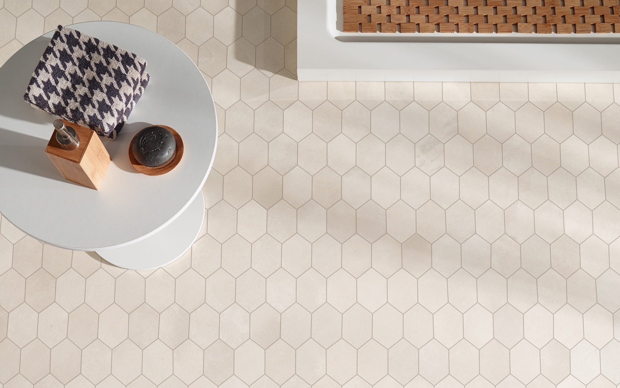 Son graphisme est celui du ciment, où l'effet des sels est perçu à travers les réflexions brillantes / mates. Une surface intemporelle et polyvalente qui combine l'esthétique aux avantages d'un grès cérame en pâte colorée.