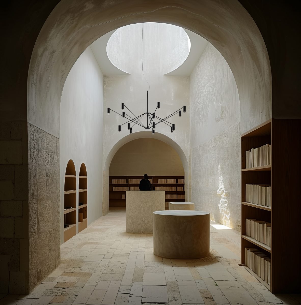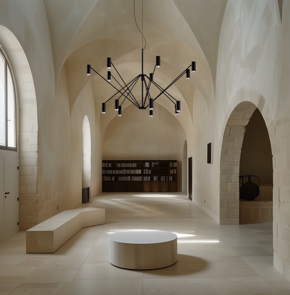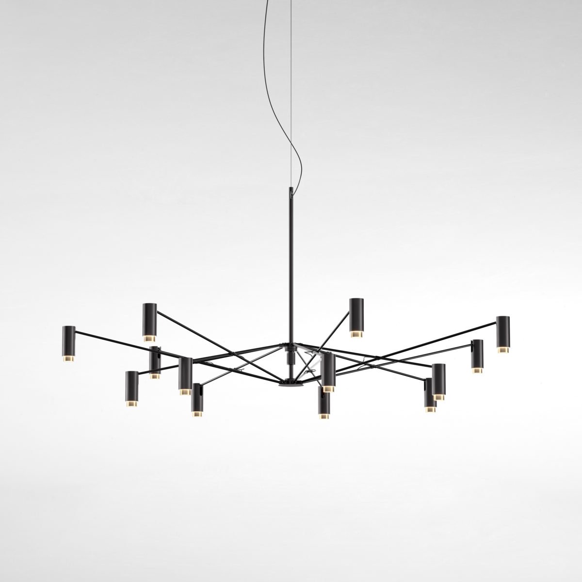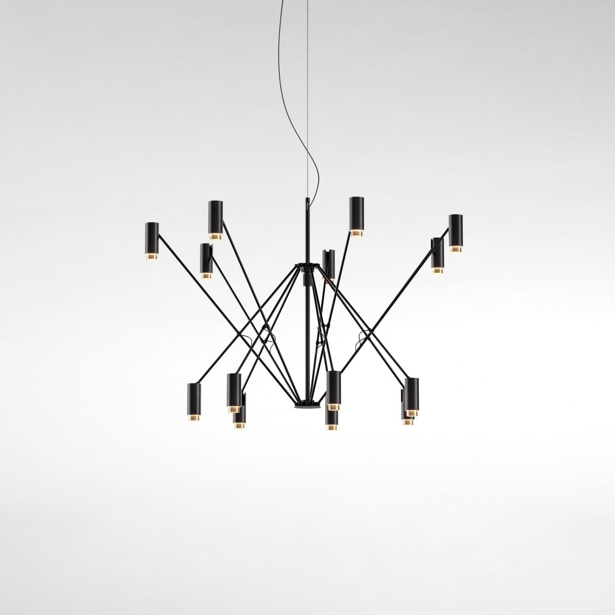 Une grande structure verticale noire constitue le puits principal d'où émergent plusieurs tiges ; certaines peuvent être déplacées vers le haut pour élargir la lumière et d'autres vers le bas pour la concentrer. Les tiges sont toutes équipées d'un spot suspendu qui projette la lumière vers le bas ou en un faisceau large et net. Les spots cylindriques - avec un anneau intérieur disponible en ivoire, terre cuite ou or - diffusent la lumière de manière uniforme.