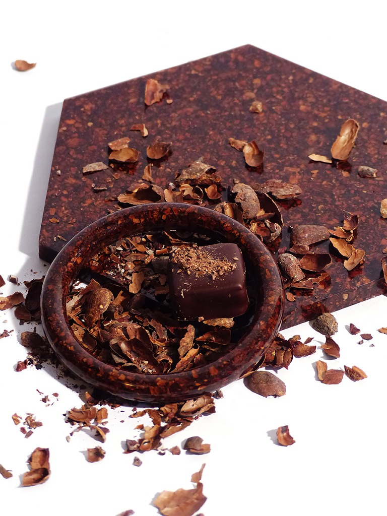 Les cosses de cacao se détachent de la fève après l’étape de torréfaction par le maître chocolatier. Les fèves ainsi dénudées, continuent leur transformation pour devenir chocolat. Nous donnons une seconde vie aux cosses, matière à l'aspect visuel si particulier, au travers de nos créations