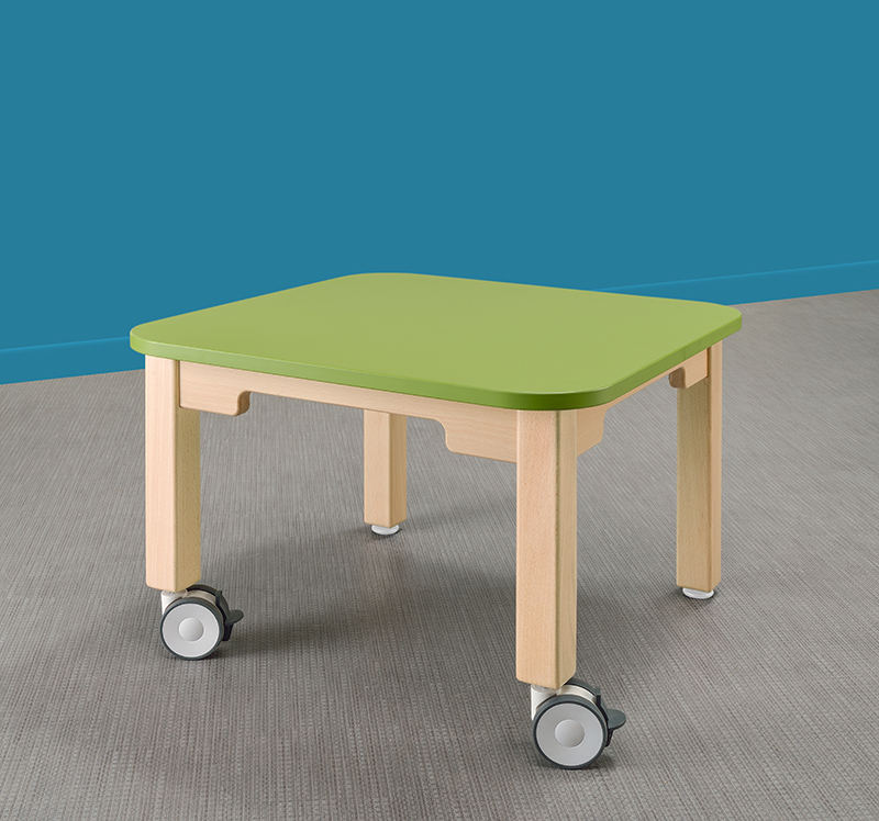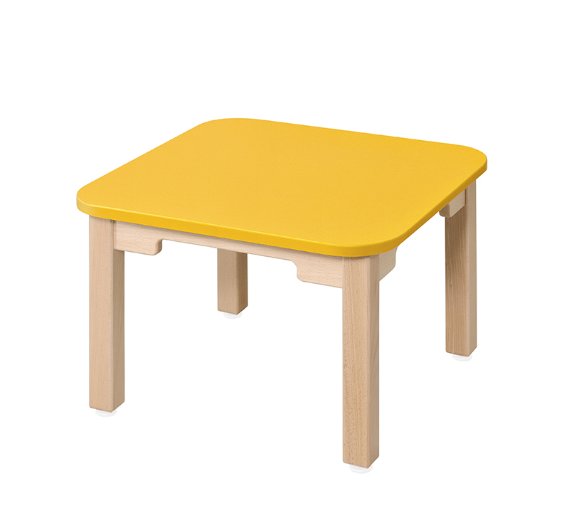 Une table carrée compacte disponible en 9 couleurs de plateau et 7 hauteurs de pieds en hêtre massif.