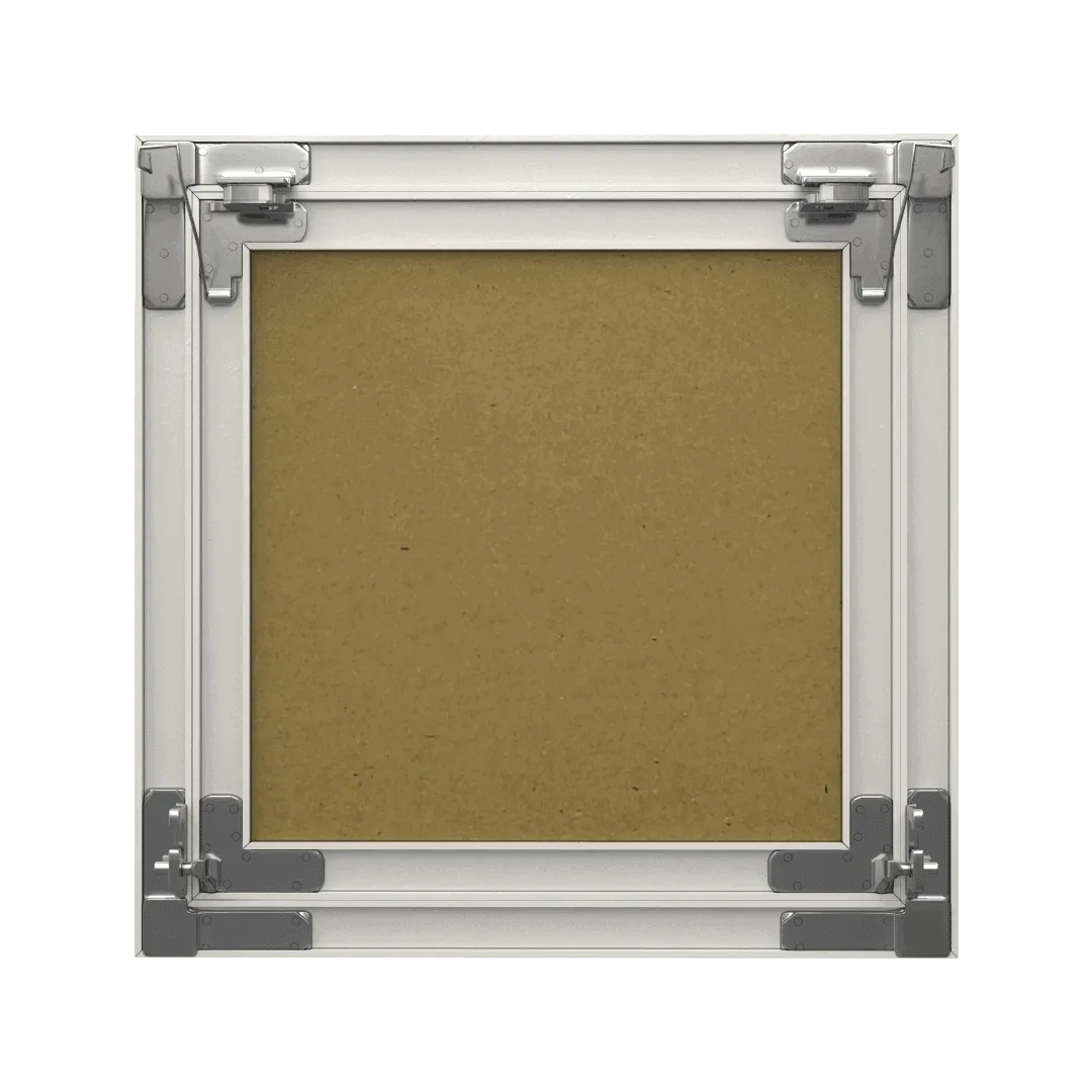 Caractéristiques : Plaque de plâtre hydrofuge H2 12,5 mm collée sur le cadre jusqu’à la dimension 600 x 600 mm (au-delà vissé sur le cadre).