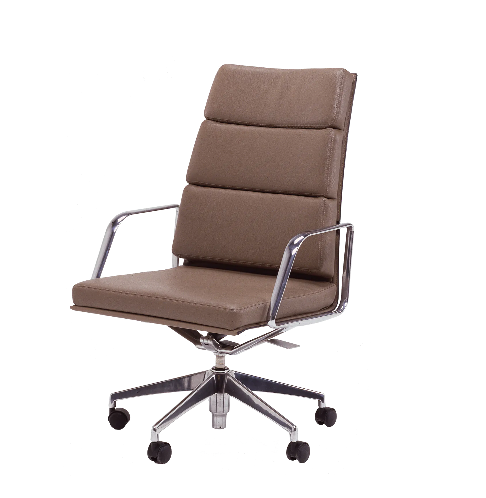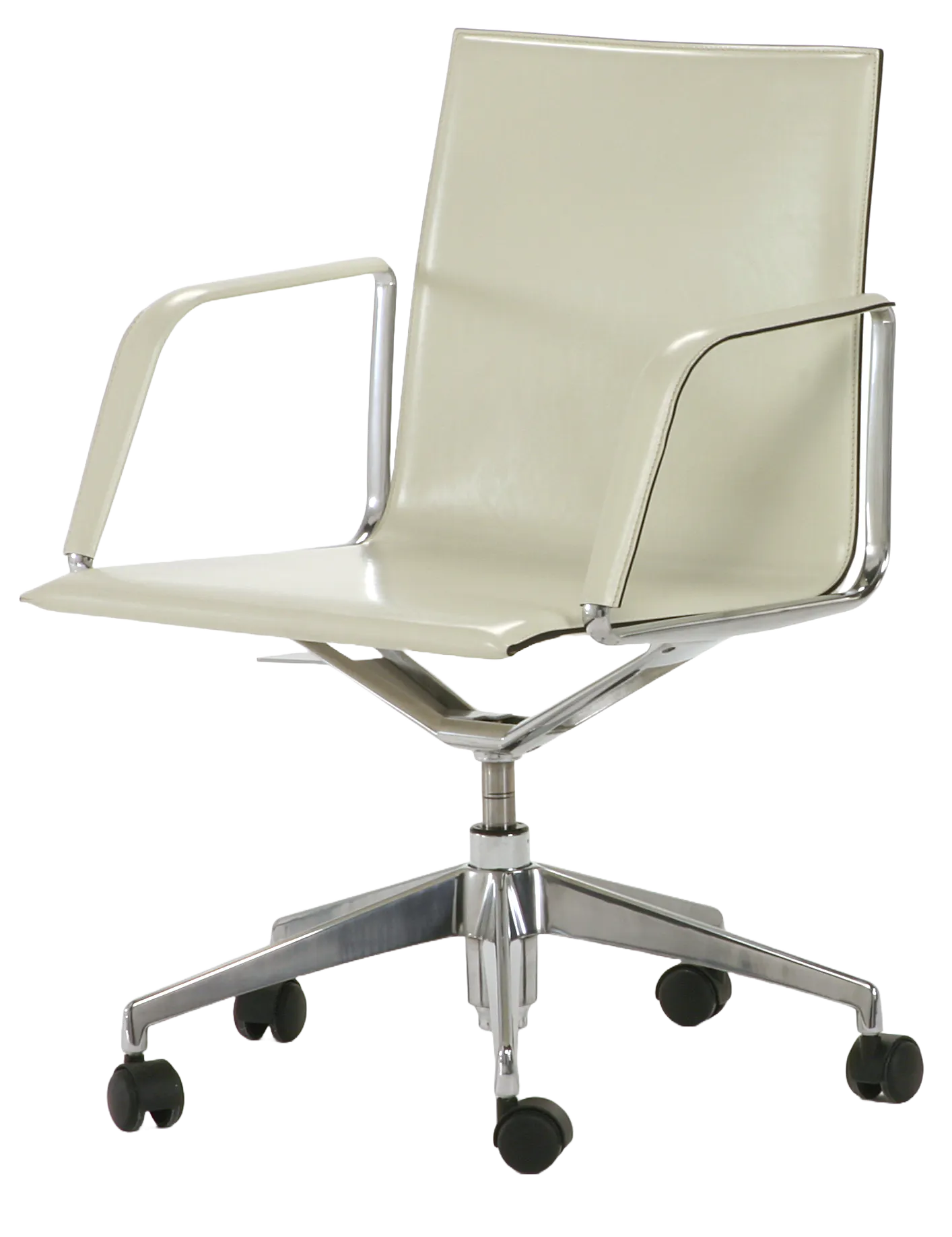 Cette série de petits fauteuils pivotants est dotée d’un support de coque et d’une base à 5 branches en aluminium moulé sous pression avec finition polie ou chromée. La coque est recouverte de cuir de carrosse, mais elle est également disponible avec des coussins en tissu ou en cuir souple. Les accoudoirs qui l’accompagnent sont assortis au support et à la base en aluminium moulé sous pression avec un choix de revêtement poli, chromé ou en cuir d’entraîneur.