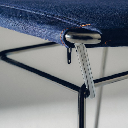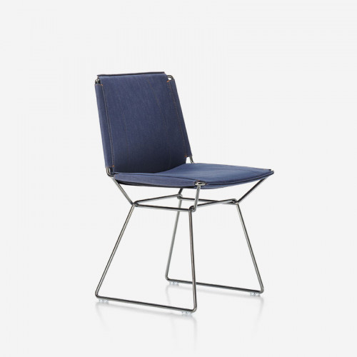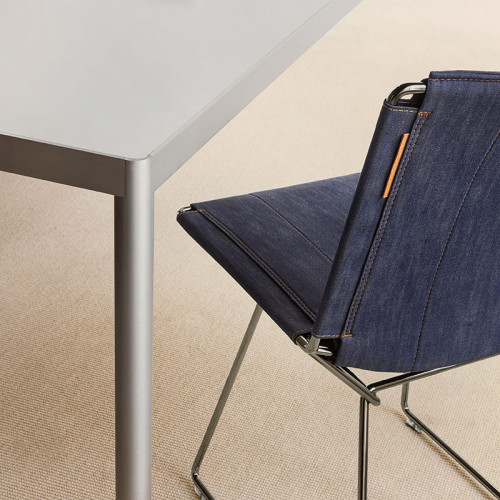 Le tissu denim, caractérisé par des coutures surpiquées et des coutures de détail contrastées couleur tabac, inspirées du jean classique, recouvre entièrement la structure en acier portante de l'assise et du dossier.