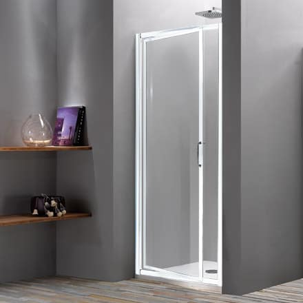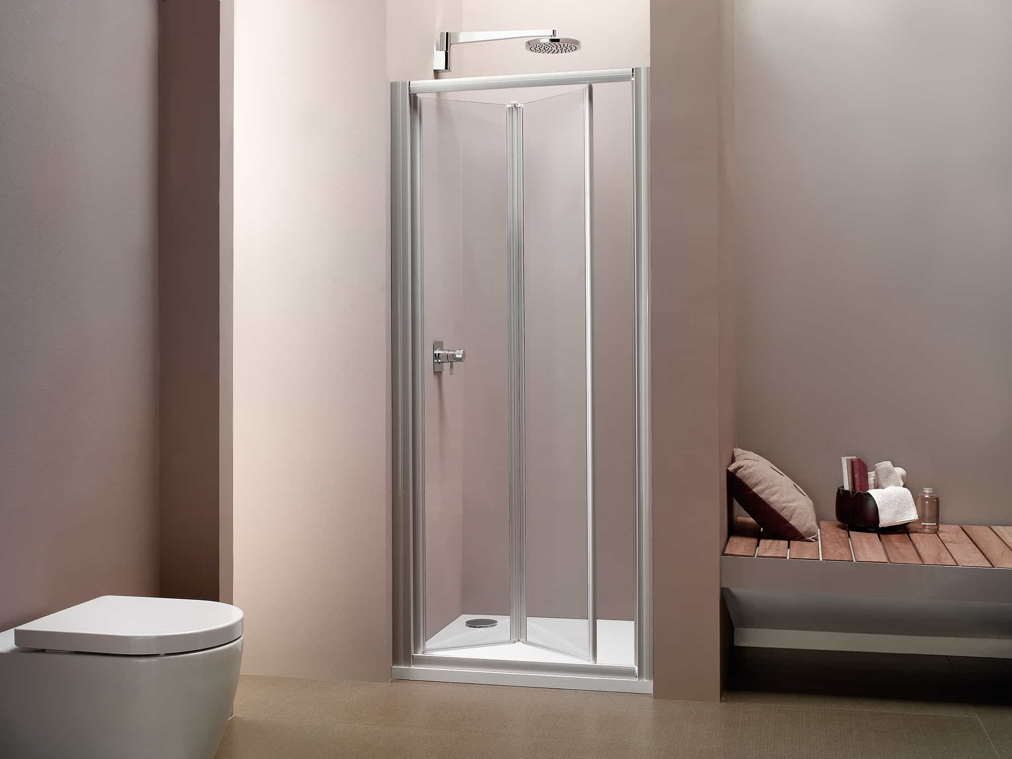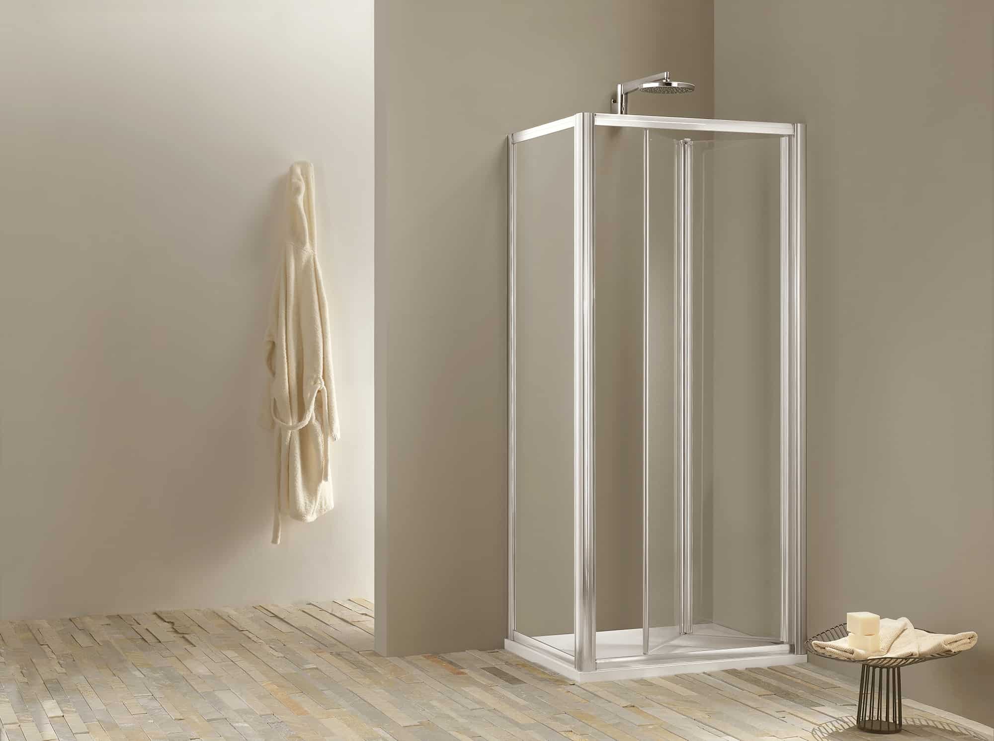 Angles et portes, portes coulissantes et pivots composent toutes les solutions Vanity avec des finitions de profilés en aluminium brillant blanc et argent RAL9010 et des finitions en verre imprimé transparent.
