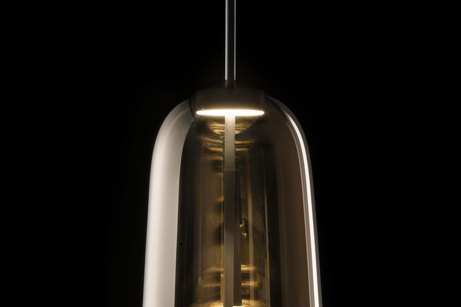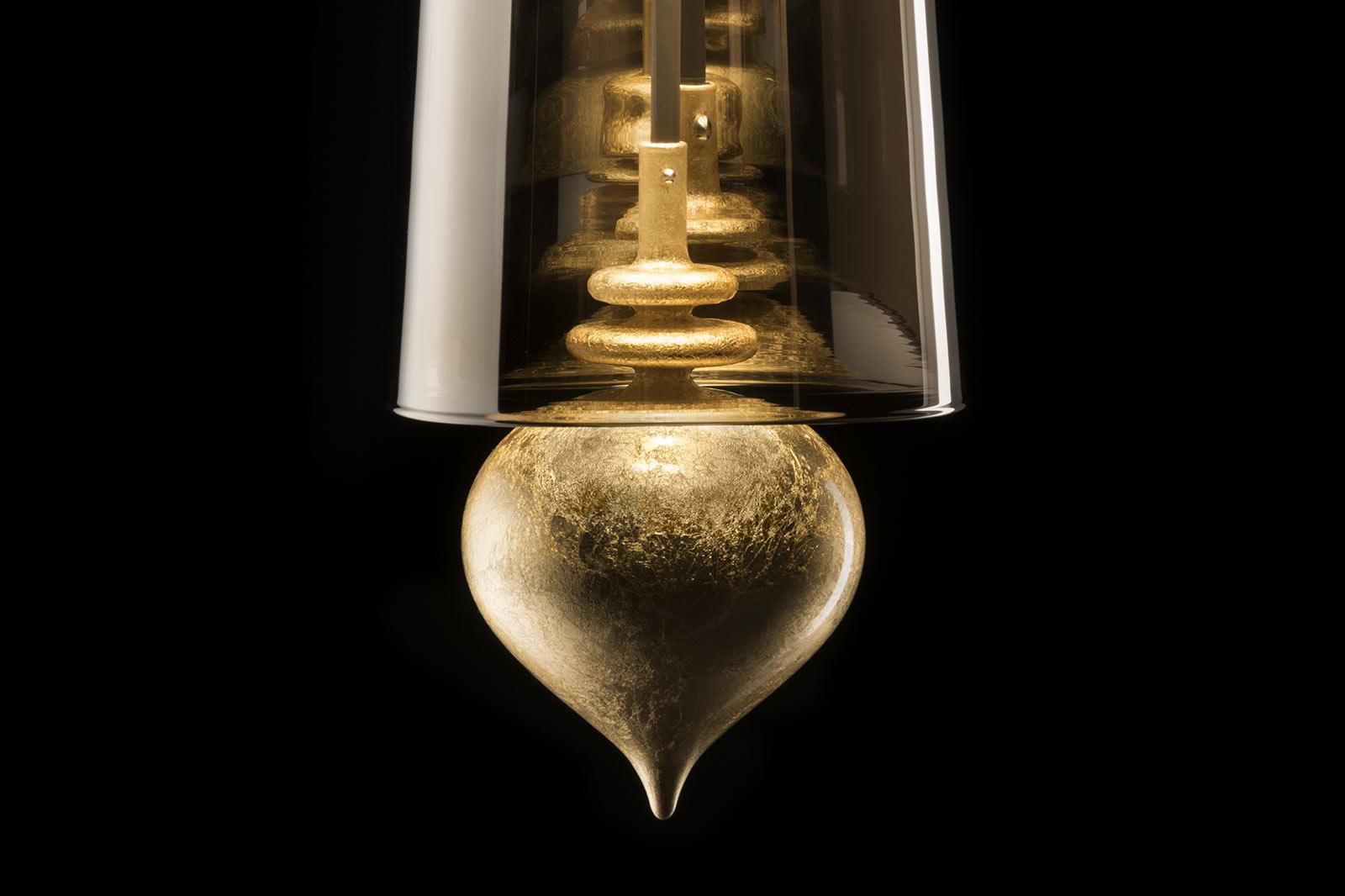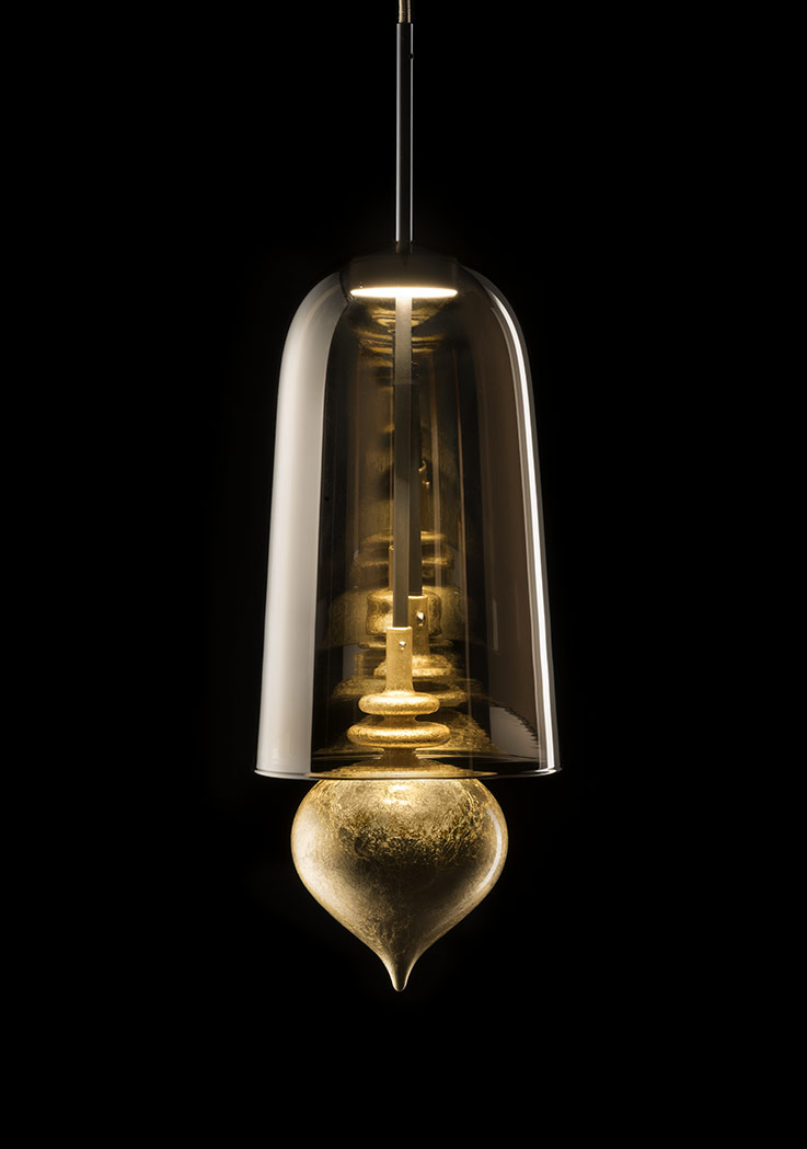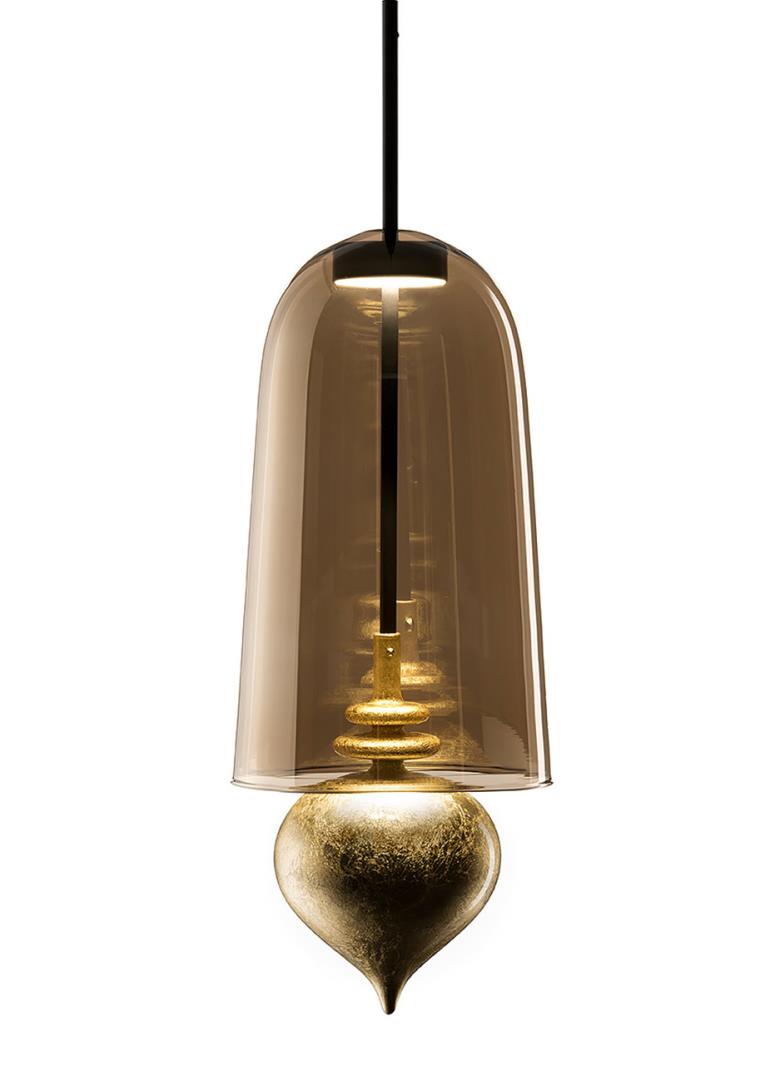 Lampe à suspension. Dôme en verre soufflé à la bouche métallisé brun avec pendentif en verre, finition feuille d’or ou dépolie.