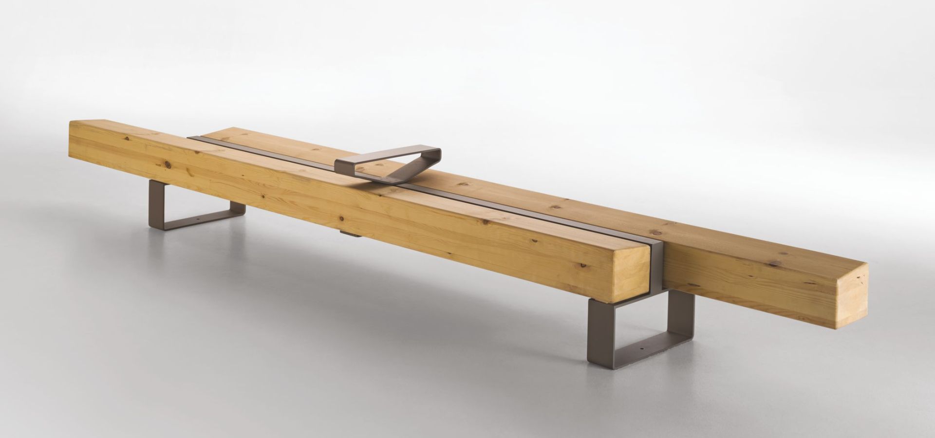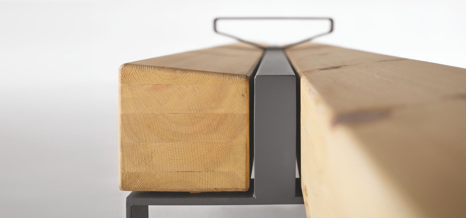 La banquette bois FORESTA est composée de 2 poutres longitudinales en bois, avec une légère inclinaison vers le centre de l’assise pour permettre l’évacuation des eaux de pluies. La structure ainsi que l’accoudoir central sont en acier.