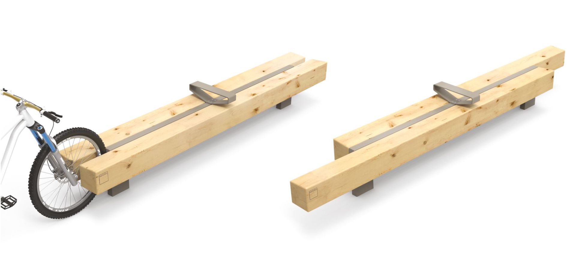 Ce banc bois urbain peut être fournie avec des poutres en bois disposées en quinconce ou juxtaposées permettant l’utilisation des extrémités comme range-vélos.