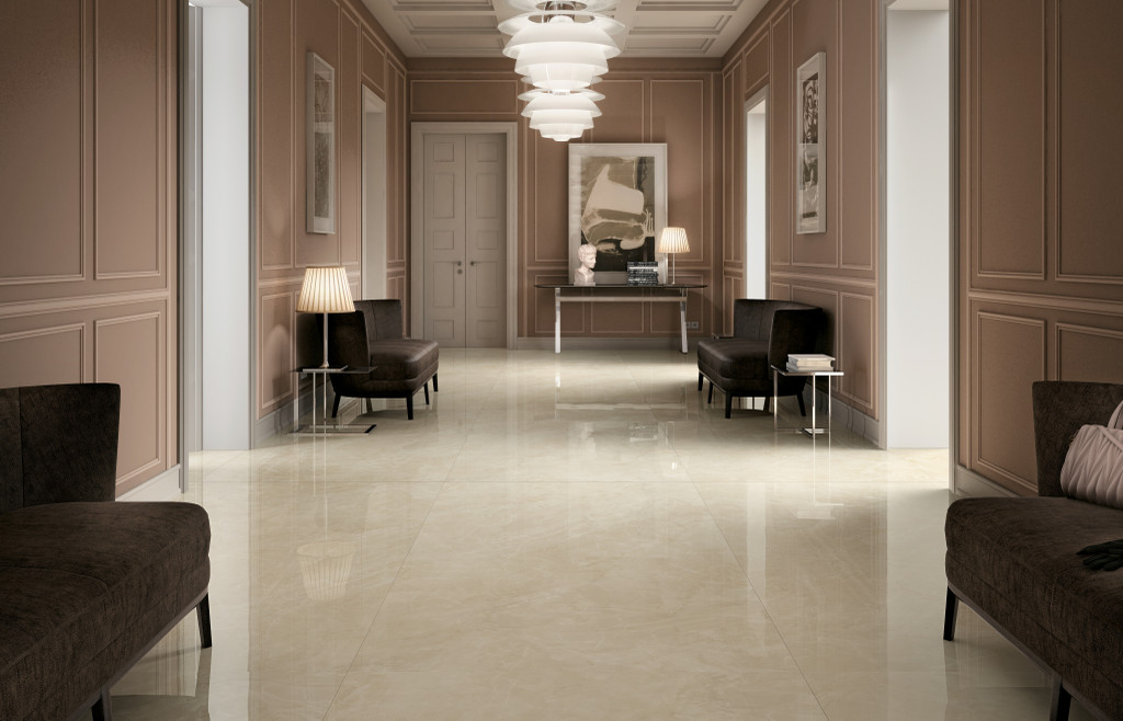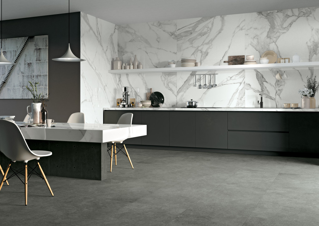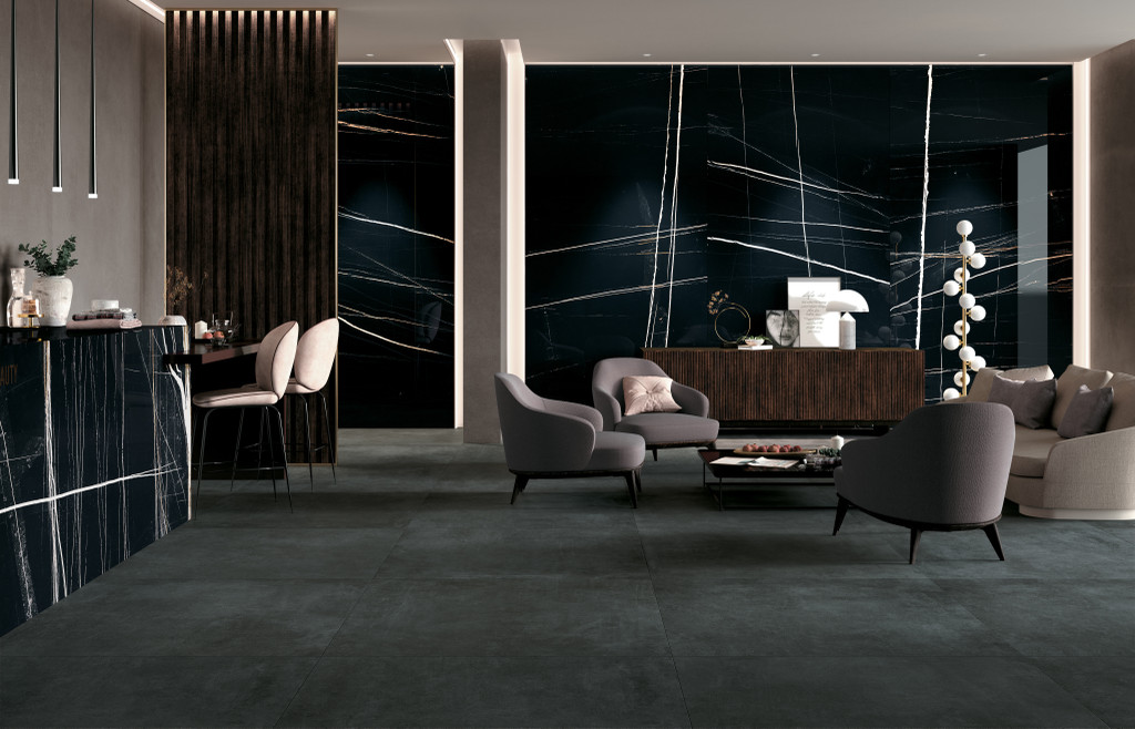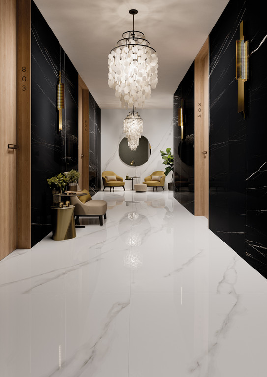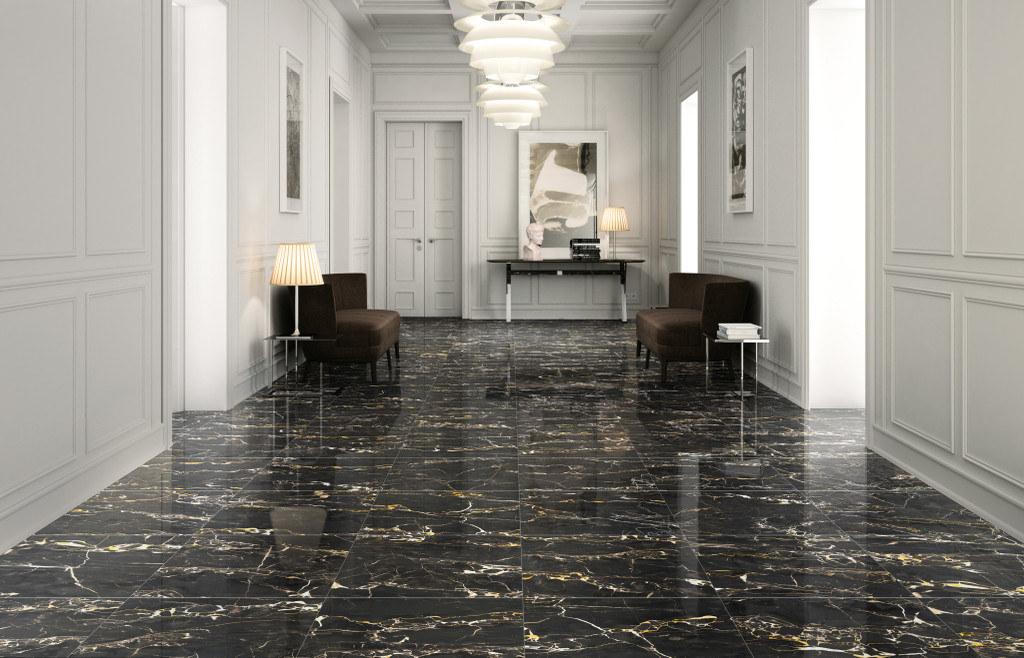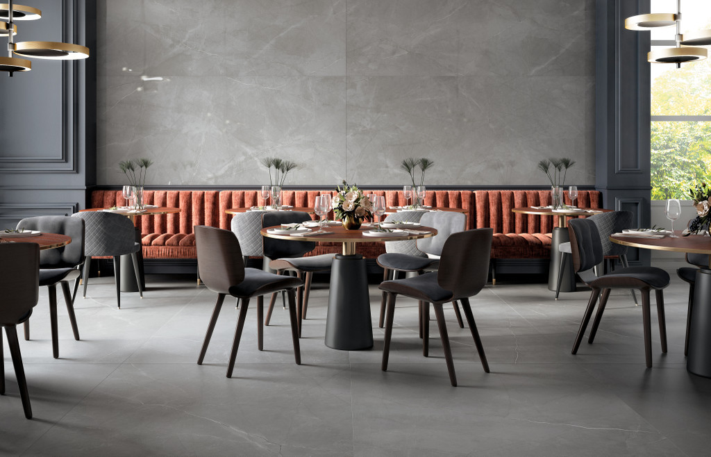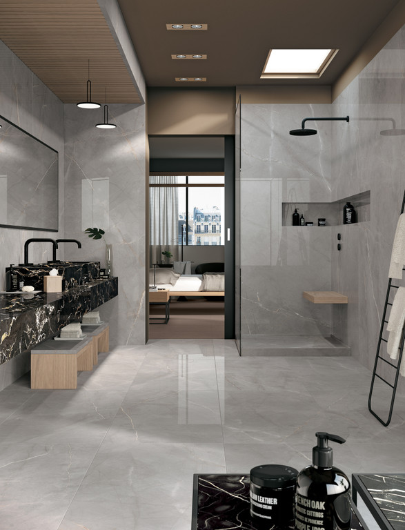 Le rendu effet marbre du grès cérame Jewels embellit les espaces d'un charme que seule