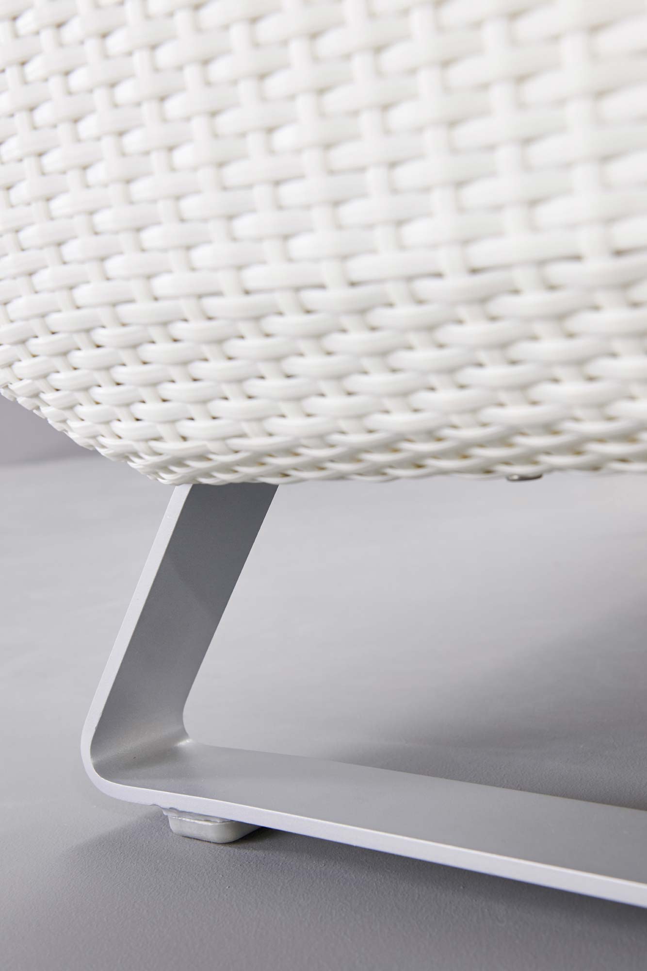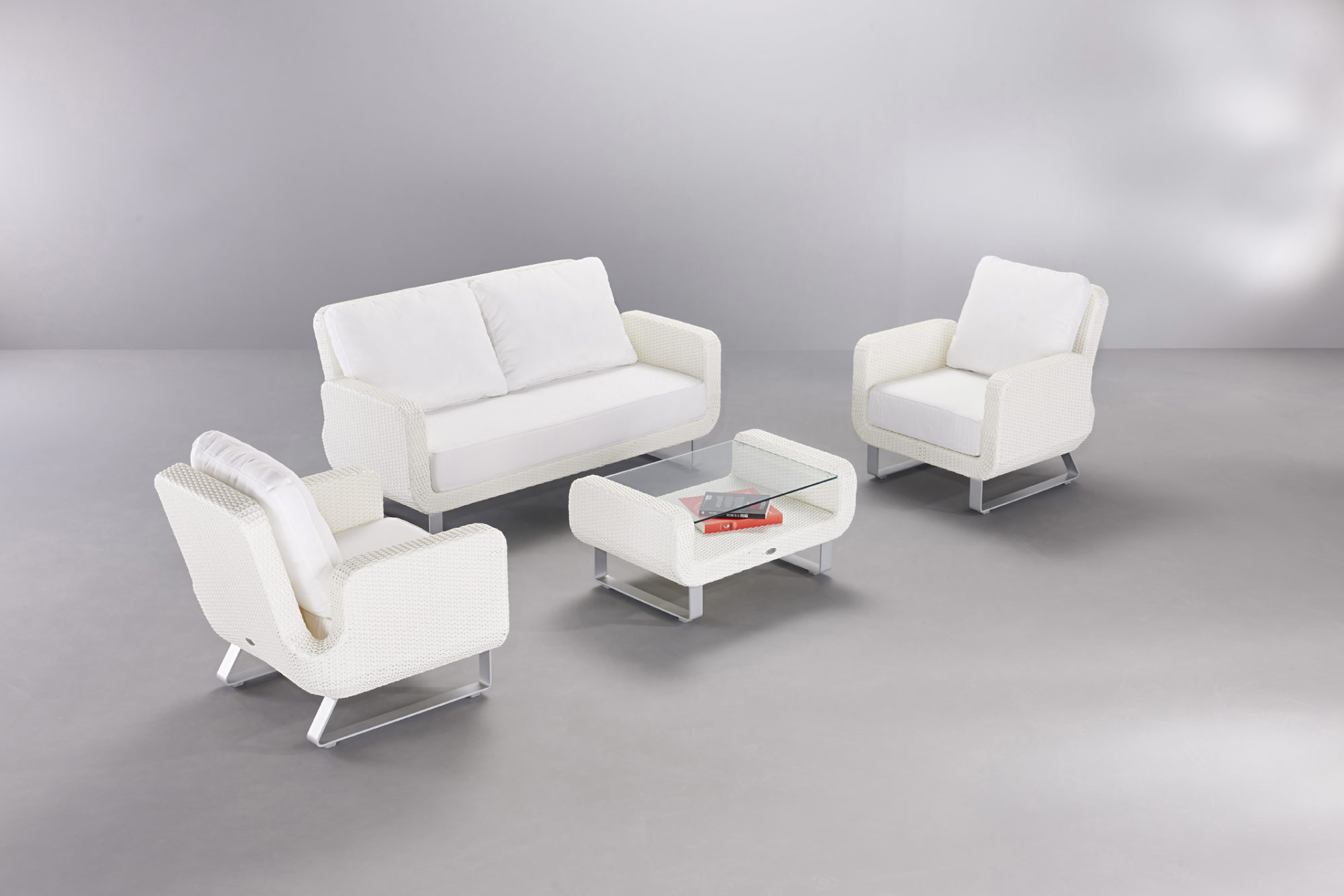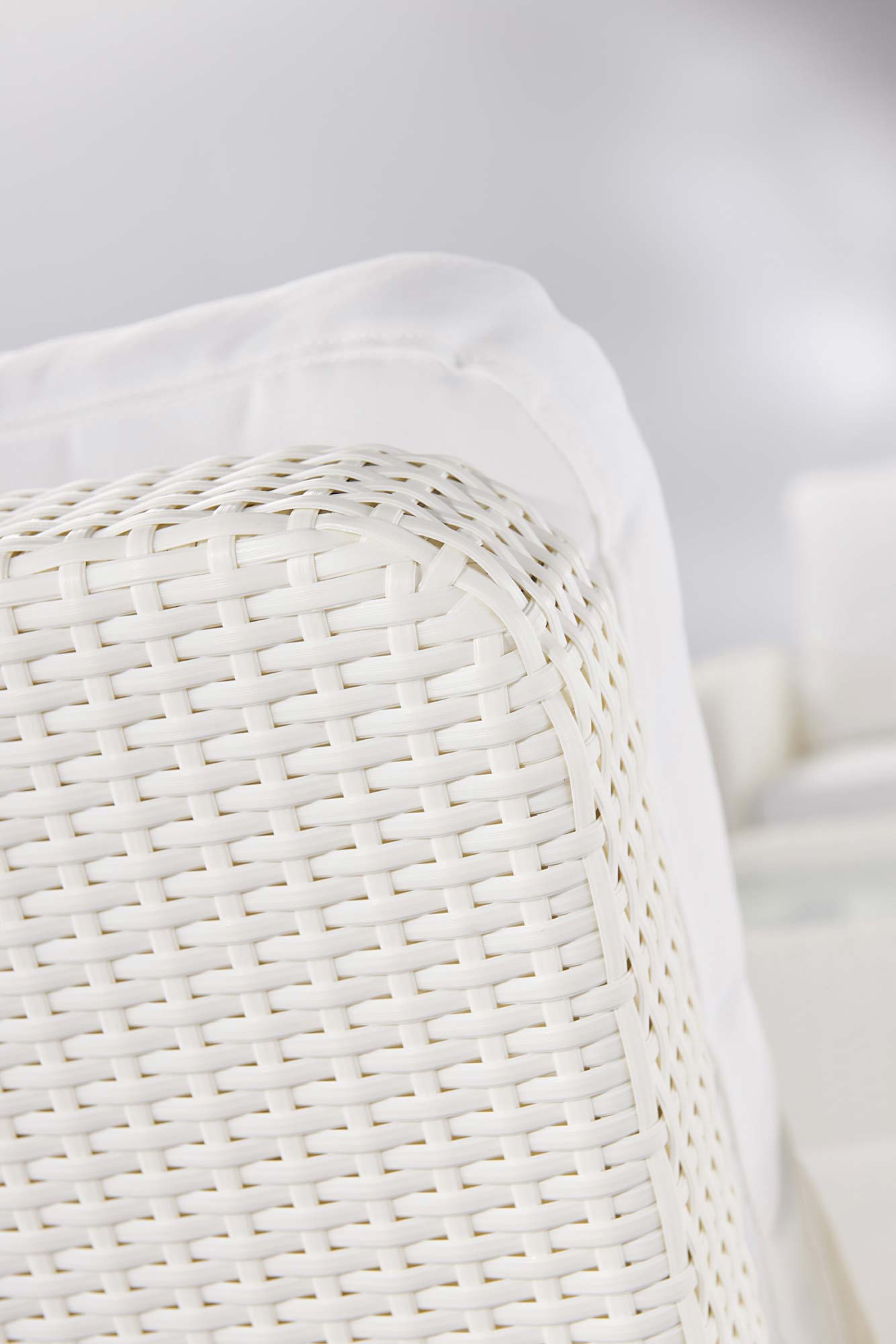 Canapé de jardin réalisé en aluminium et recouvert de résine tressée Wintech blanche. Choix de coussins dans toute la gamme Sunbrella®.