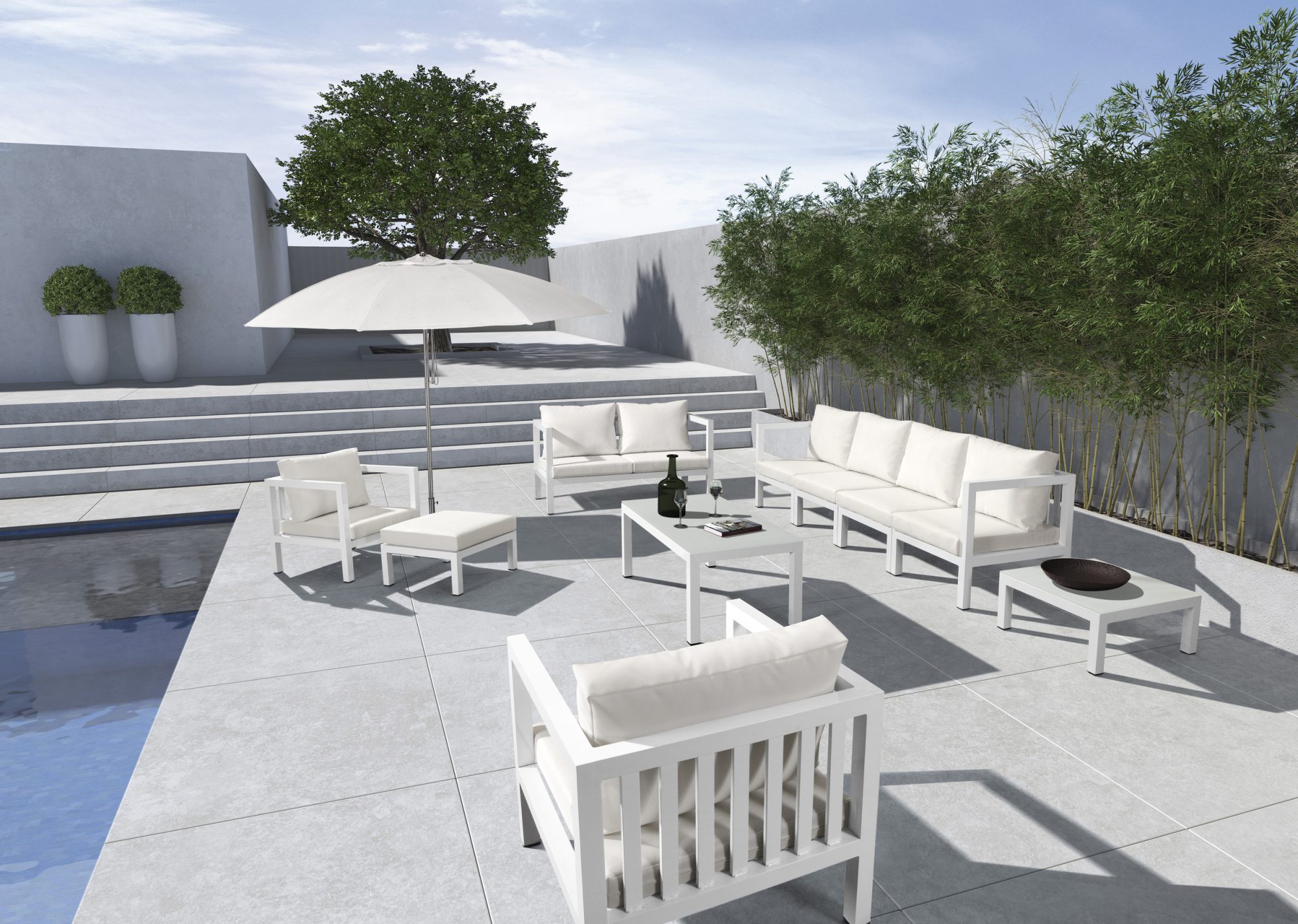 Le canapé CURTIS est en structure aluminium coloris blanc et coussins Batyline® coloris taupe ou blanc.