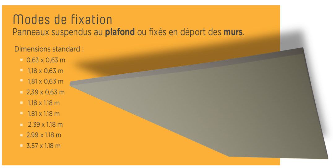 Nul besoin de recouvrir toute la surface des murs ou du plafond : en ne recouvrant que 35% de la surface (répartis entre murs et plafonds), vous pouvez réduire la réverbération du son de 50% grâce à l’efficacité acoustiques de nos panneaux en classe A.