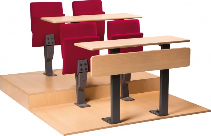 Central, pour sol plat ou adapté aux pentes et gradins Structure métallique supportant l’assise, le dossier et la table du rang suivant Platine en acier avec 4 ou 6 fixations suivant type de sol Traitement des parties métalliques par grenaillage et peinture coloris au choix