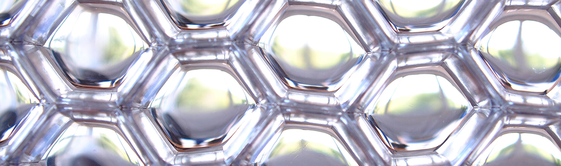 L'effet "fish-eye" de B-Clear est obtenu en collant notre âme hexagonale en nid d'abeille en aluminium entre des peaux en verre, en acrylique ou en polycarbonate.