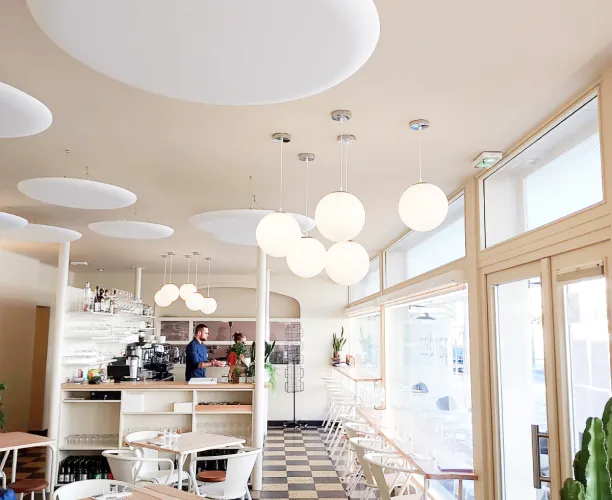 La suspension Kinô concilie acoustique et éclairage. Cette association fonctionnelle permet d’apporter une touche déco et chaleureuse à tous vos types d’espaces. Créez une ambiance feutrée et apportez une touche design à vos espaces commerciaux.