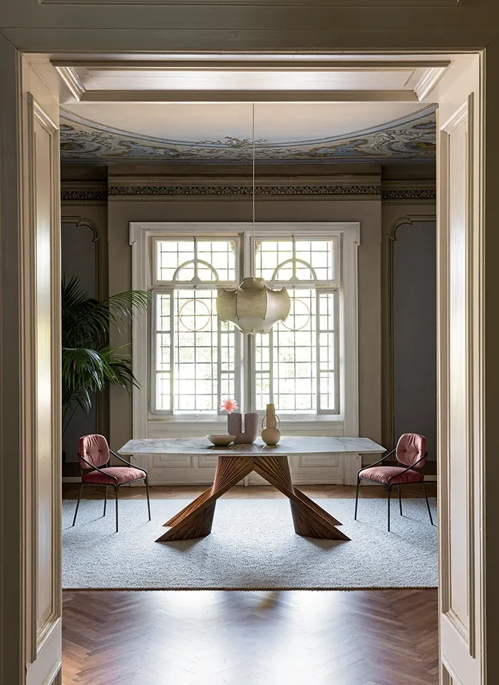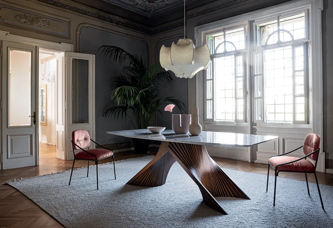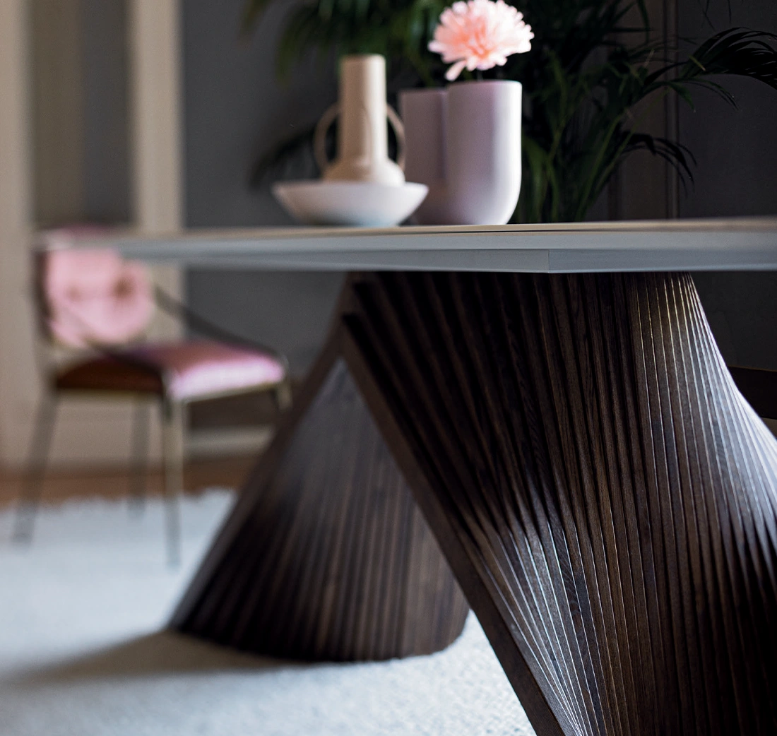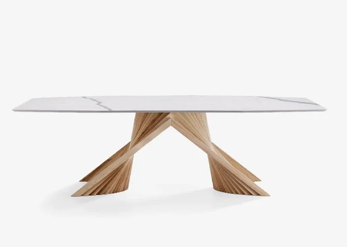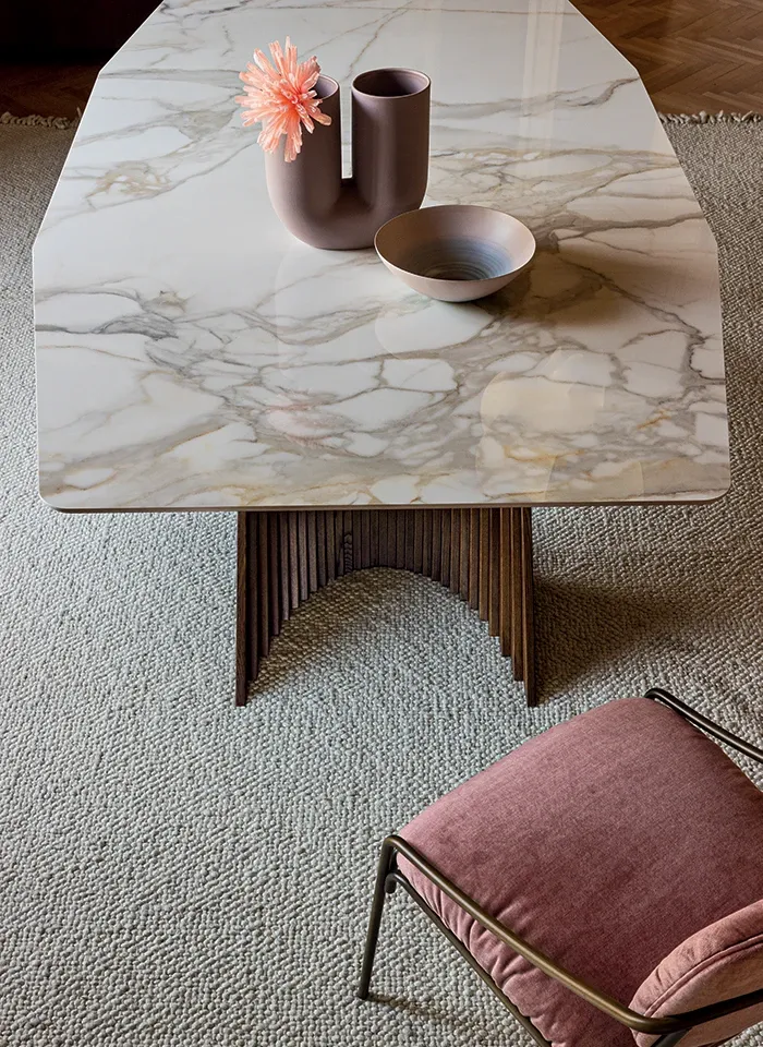 Trois finitions fines en bois de frêne ont été sélectionnées pour la base, composée de plus de 70 lames faites à la main selon la tradition artisanale. Le plateau en grès marbre, poli ou mat, est réalisé en différentes formes et tailles, pour satisfaire les préférences des amateurs de Made in Italy.