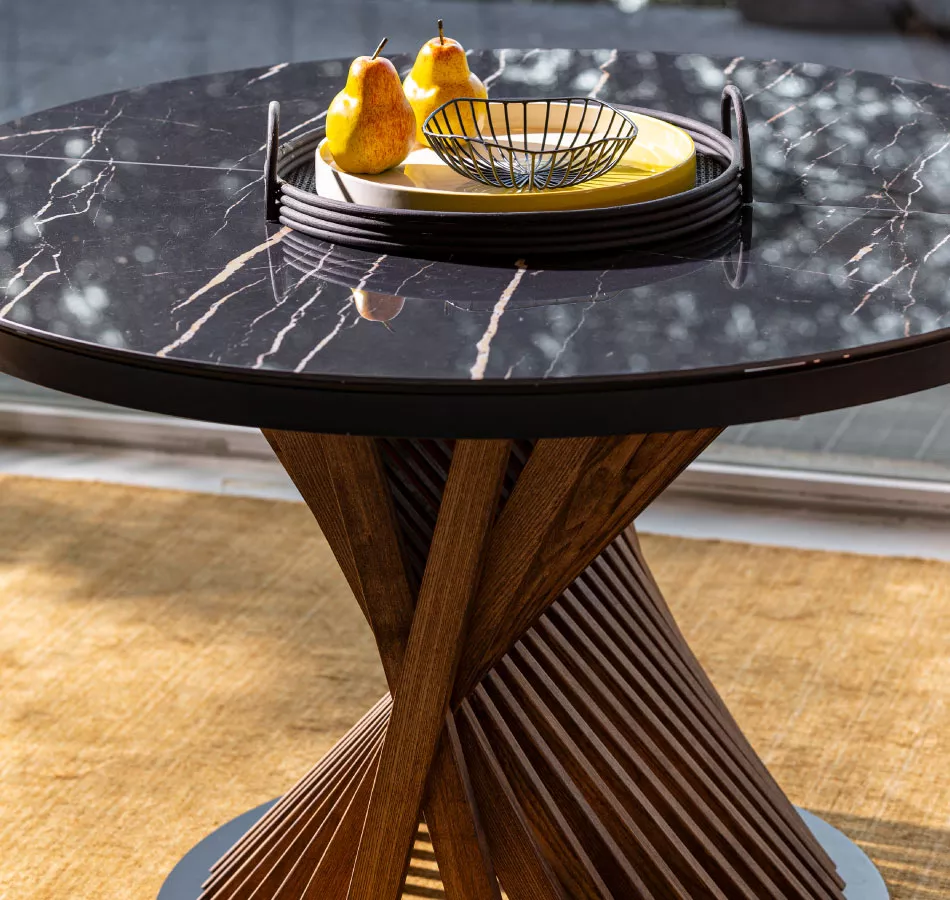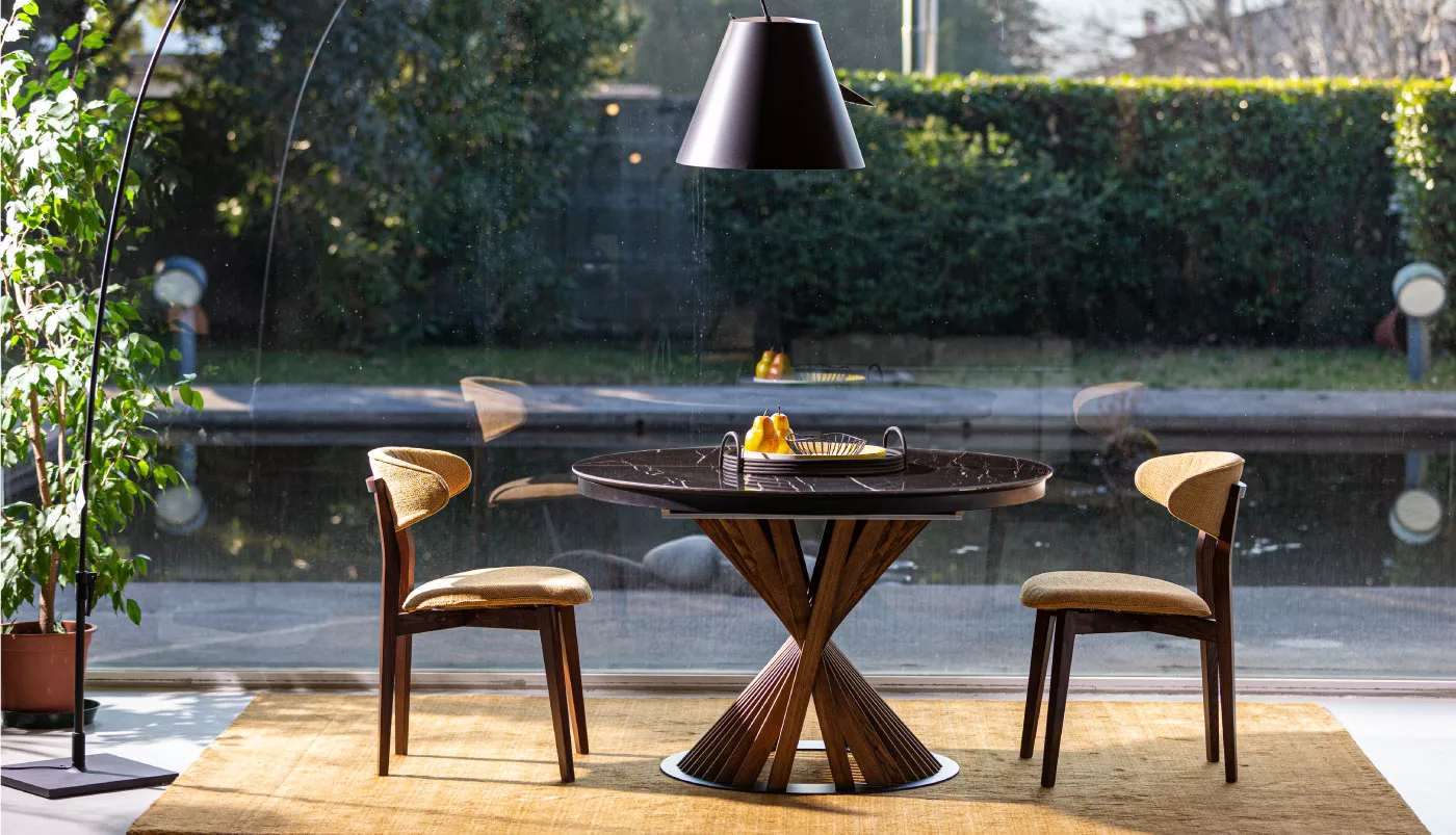 Natisa poursuit son chemin de recherche et de synthèse entre l’artisanat et le design contemporain, créant un nouveau développement d’une idée de construction absolument originale. La base de cette table est en effet formée de lames de bois croisées autour d’une poutre centrale invisible, comme dans la collection Wave, mais leurs lignes sont disposées symétriquement afin de créer une seule forme enveloppante, comme un nid ou le calice d’une fleur. La beauté de cette création, légère et en même temps stable grâce à la section accrue des bandes, est mise en valeur par le haut.