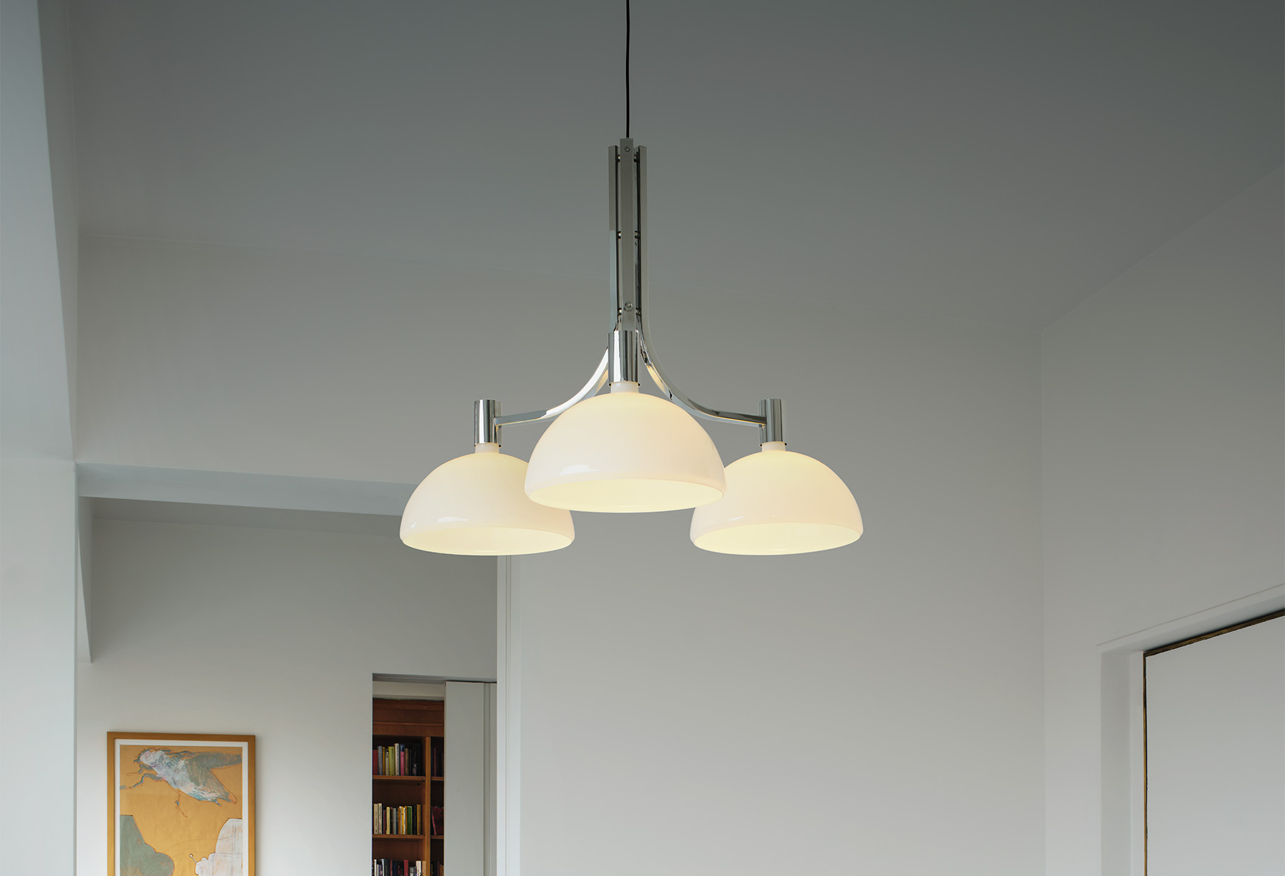 La collection Albini AM/AS représente la philosophie rationaliste de l’architecte milanais. Un design de 1969 qui combine les formes linéaires avec l’extrême qualité des matériaux utilisés, comme le verre soufflé des diffuseurs. Le but est de gérer les différents volumes de l’espace avec un seul design: plafond, mur, sol et table.