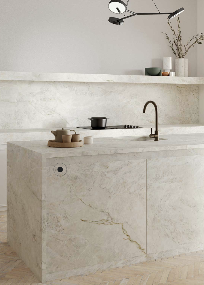 Inspiré de la majesté de la montagne la plus haute du monde, le mont Everest, ce modèle deviendra clairement l'élément phare de votre maison. Everest Sunrise est un quartzite pur et parfaitement équilibré qui combine une couleur douce et paisible évoquant les montagnes de l'Himalaya et un éclat subtil et brillant aux reflets dorés rappelant les levers de soleil depuis le toit du monde. Un modèle qui incarne l'élégance, l'exclusivité et la pureté. Prêt à illuminer tous les espaces de votre maison.