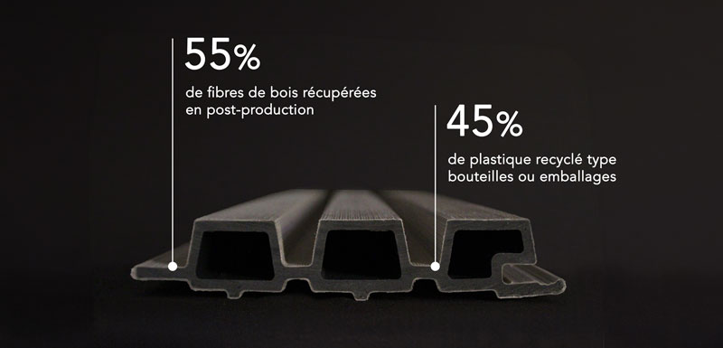 Le produit LAME BARDAGE CLAIRE VOIE COMPOSITE NEO XL de Neowood est composé de : Bois et dérivés .