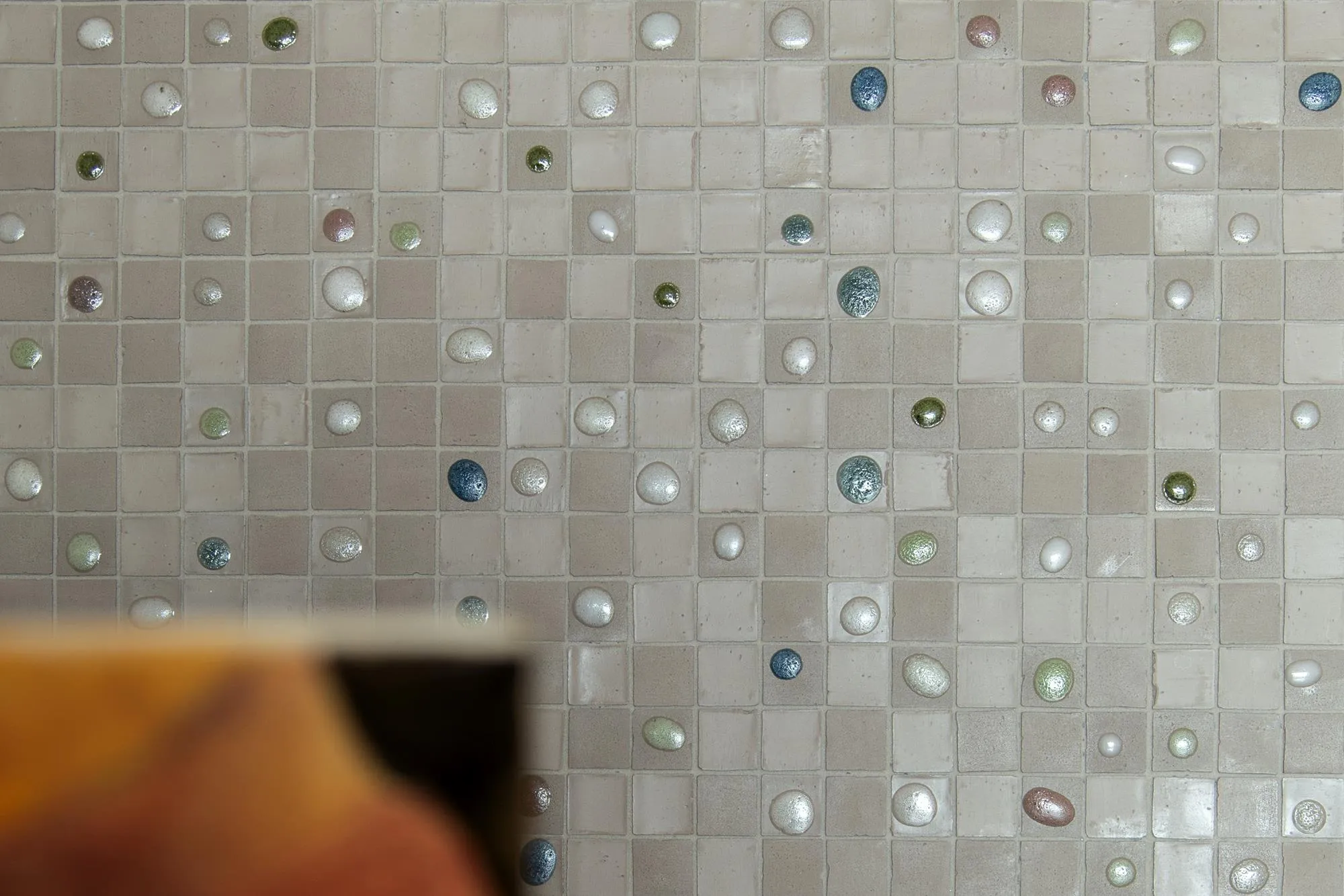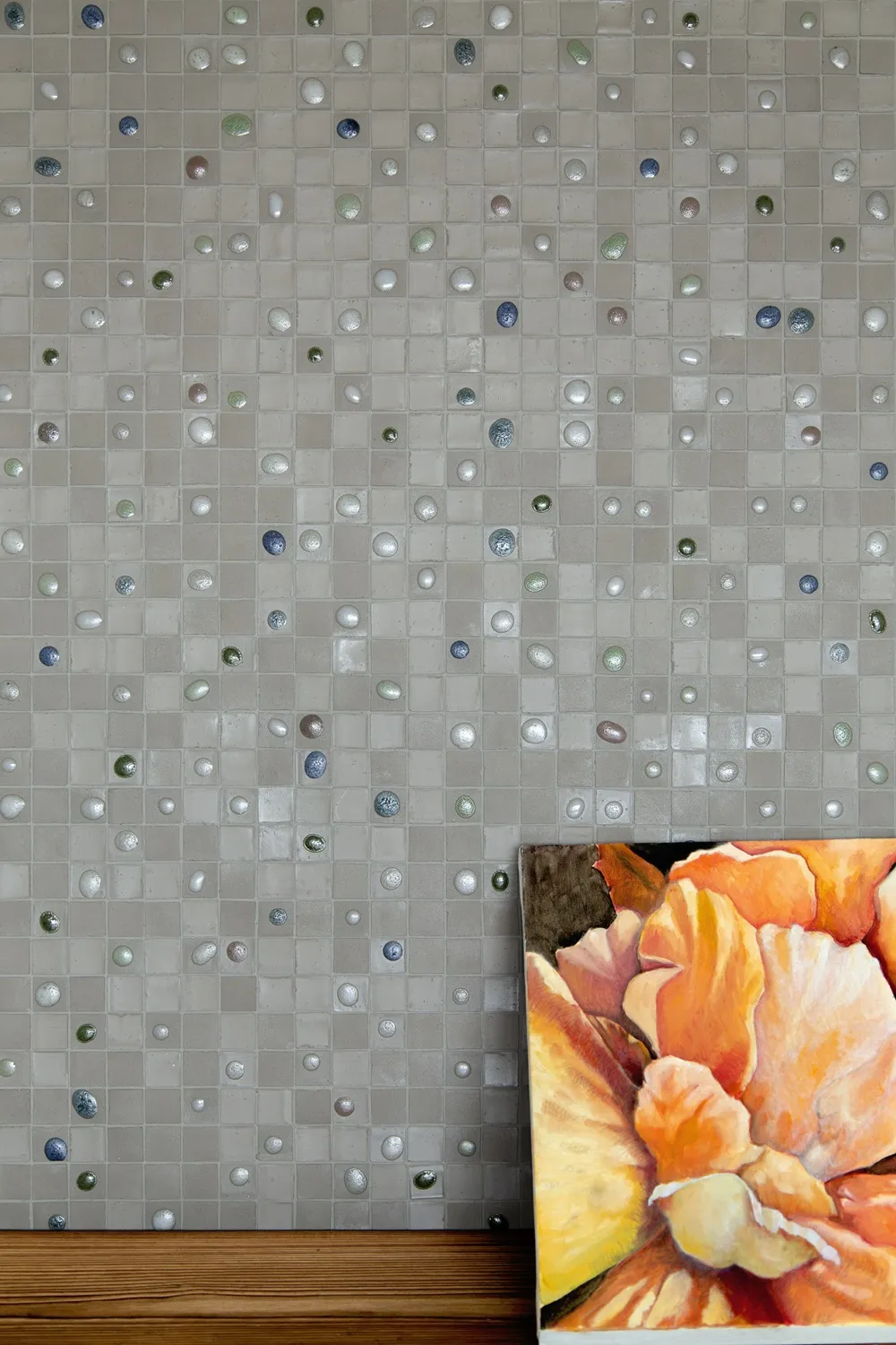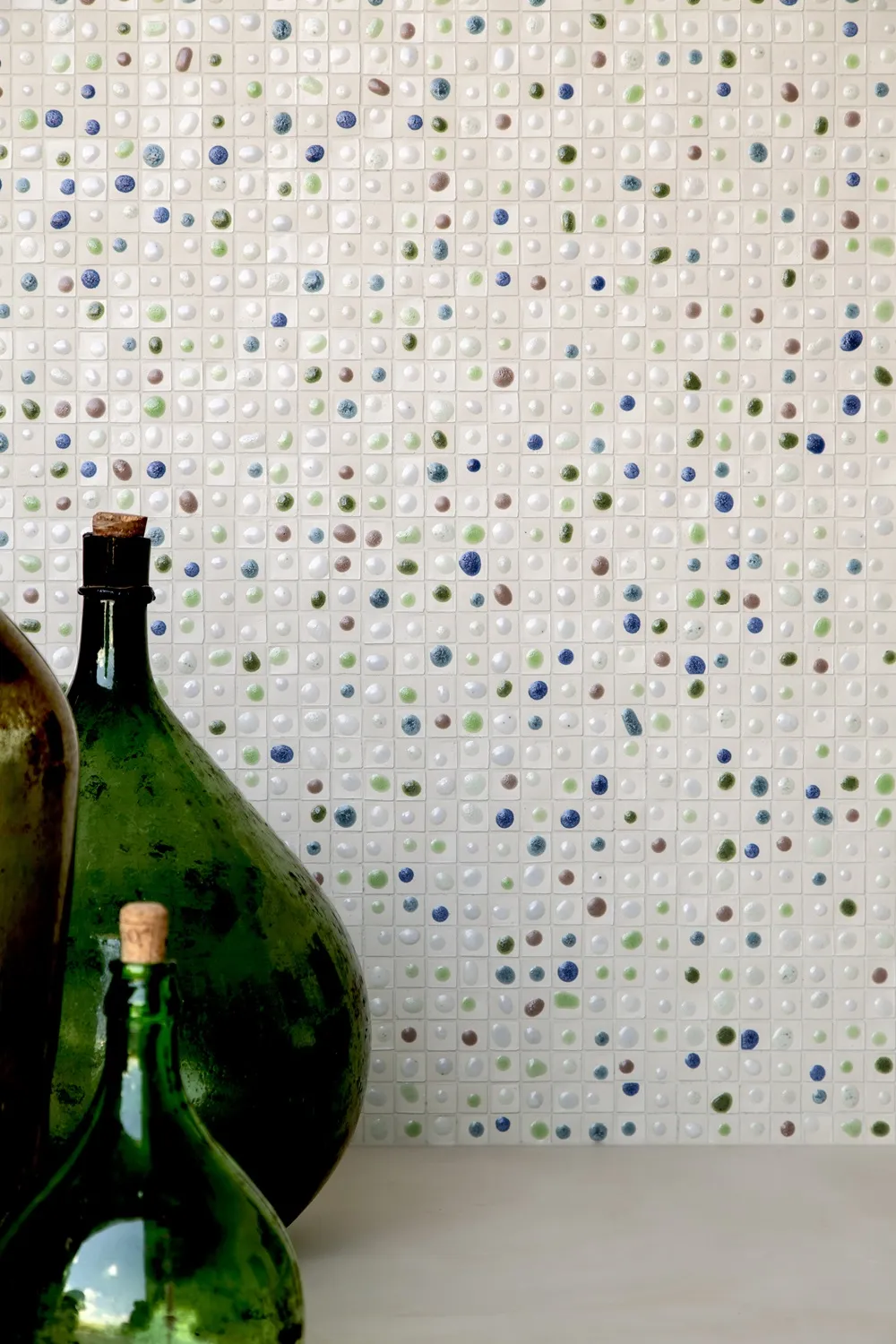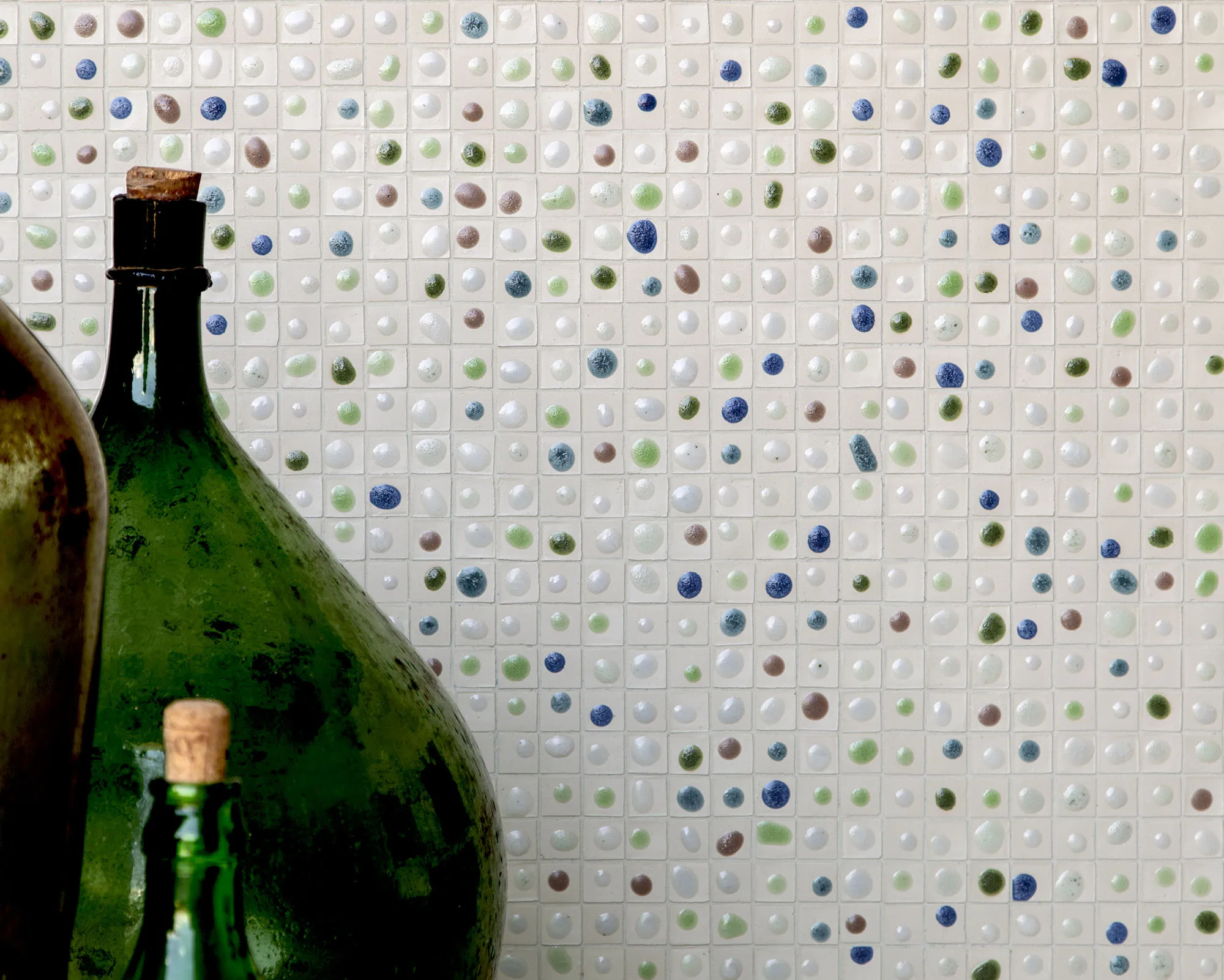 La collection est réalisée avec des carreaux obtenus avec un nouveau mélange de verre recyclé et d’argile sur lequel le verre recyclé pigmenté a été fondu, donnant vie à des résultats chromatiques surprenants.
