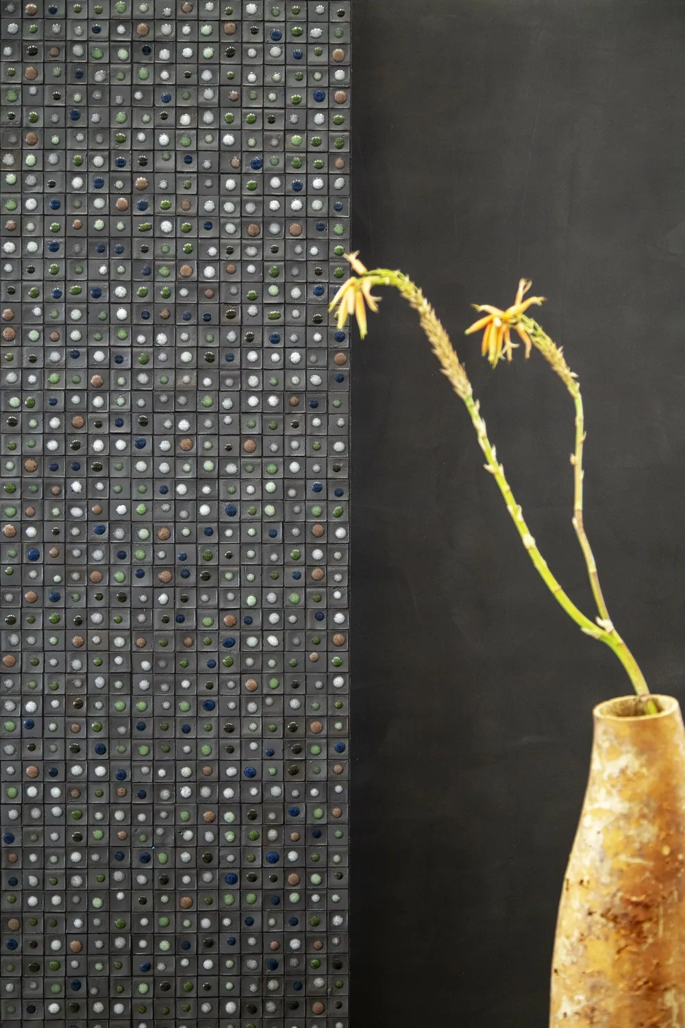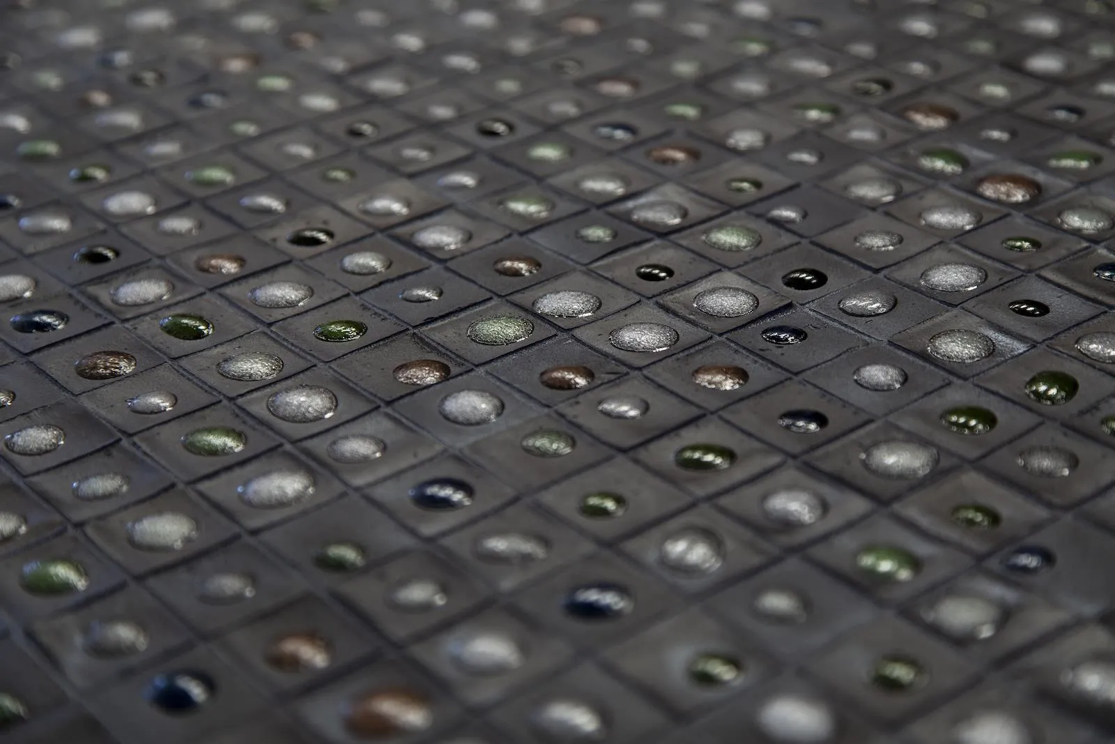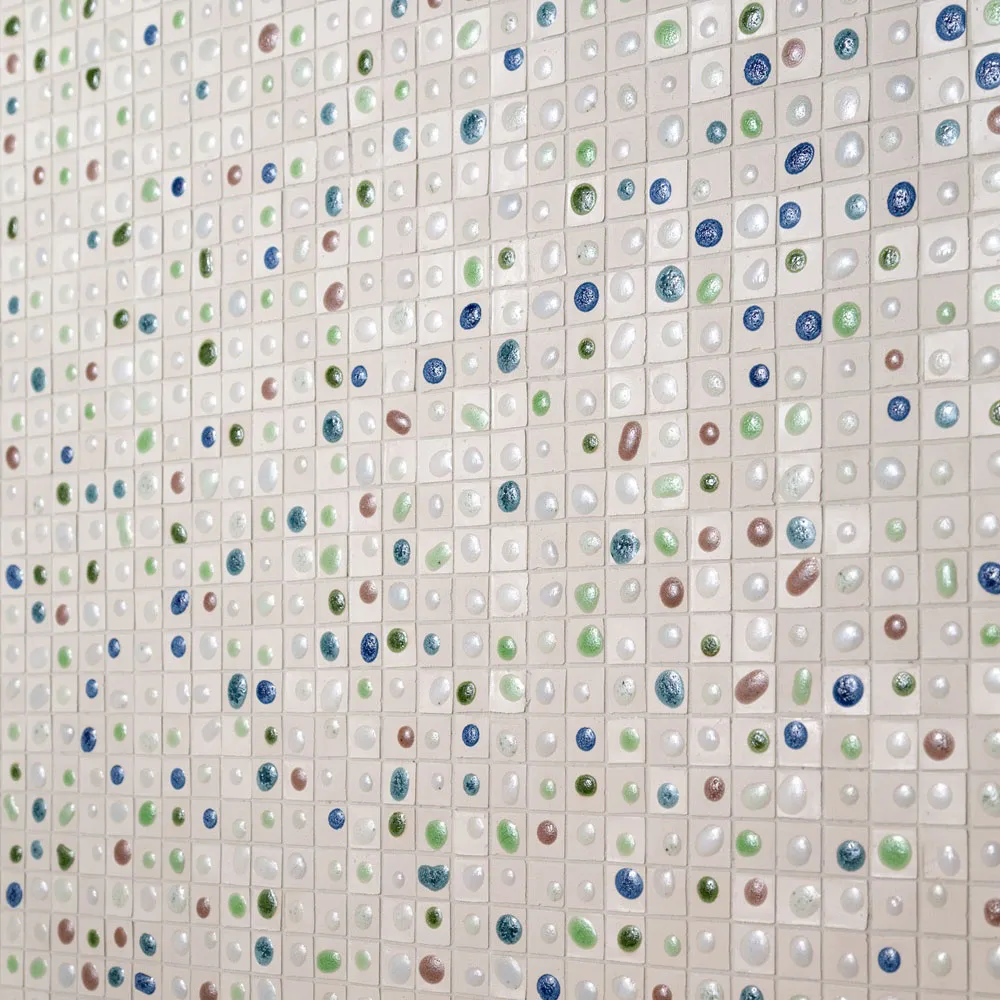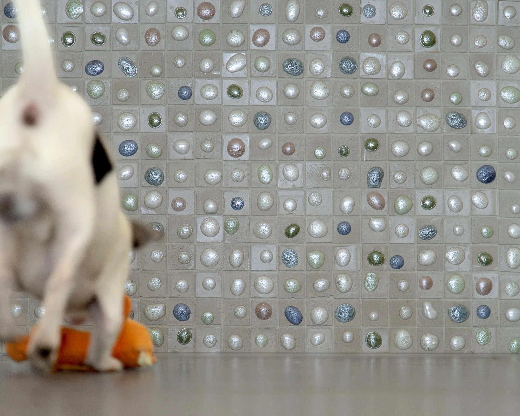 La collection est réalisée avec des carreaux obtenus avec un nouveau mélange de verre recyclé et d’argile sur lequel le verre recyclé pigmenté a été fondu, donnant vie à des résultats chromatiques surprenants.
