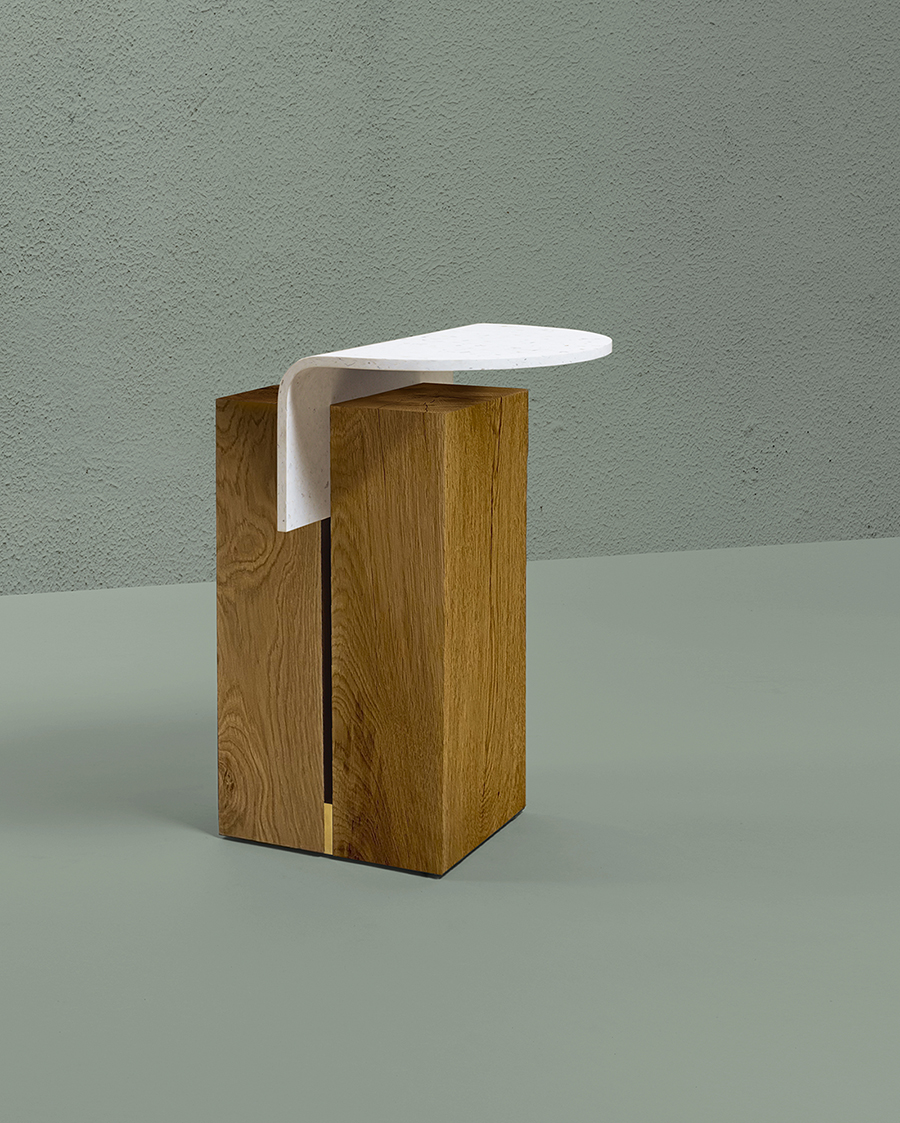 C’est l’alliance un peu contre nature d’un plateau en plastique recyclé, d’un socle en chêne recyclé naturel ou teinté au Brou de noix et d’une entretoise en laiton.