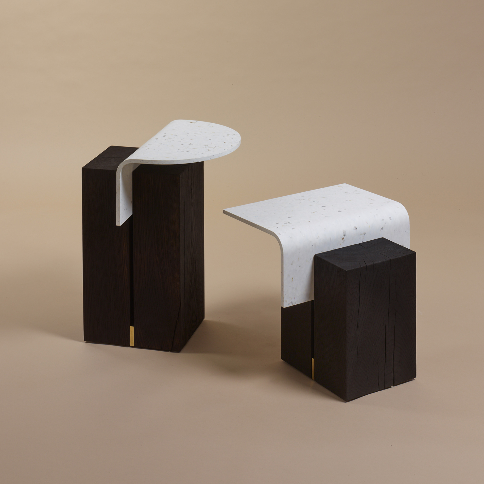 « Les pieds de la table Ghan ont des histoires à conter : débités dans des chutes de production de traverses de chemin de fer, elles sont ensuite cirées ou teintées au Brou de noix. Le plateau en plastique recyclé et cintré est glissé entre deux blocs de bois massif. Un équilibre se crée entre la base dense et brute de la table et les lignes douces du plateau. »Charlotte Juillard