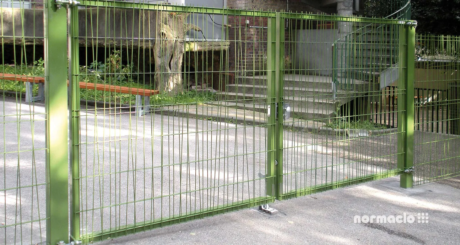 Le portail pivotant treillis OOBAMBOO™ associe un cadre en tubes d’acier galvanisé à chaud à un remplissage en treillis soudé, dont les fils obliques rappellent l’esthétique du bambou.