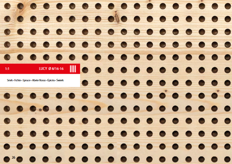 Les panneaux acoustiques sont fabriqués à partir de panneaux 3 plis en bois massif (SWP) que nous perforons sur machines CNC pour leur donner différents profils. La forme et la part de la surface perforée varie en fonction des différents profils. Selon les spécifications du projet, nous complétons nos panneaux avec des absorbants et un contre-lattage. Sur demande, nous pouvons également appliquer de la lasure sur les panneaux.