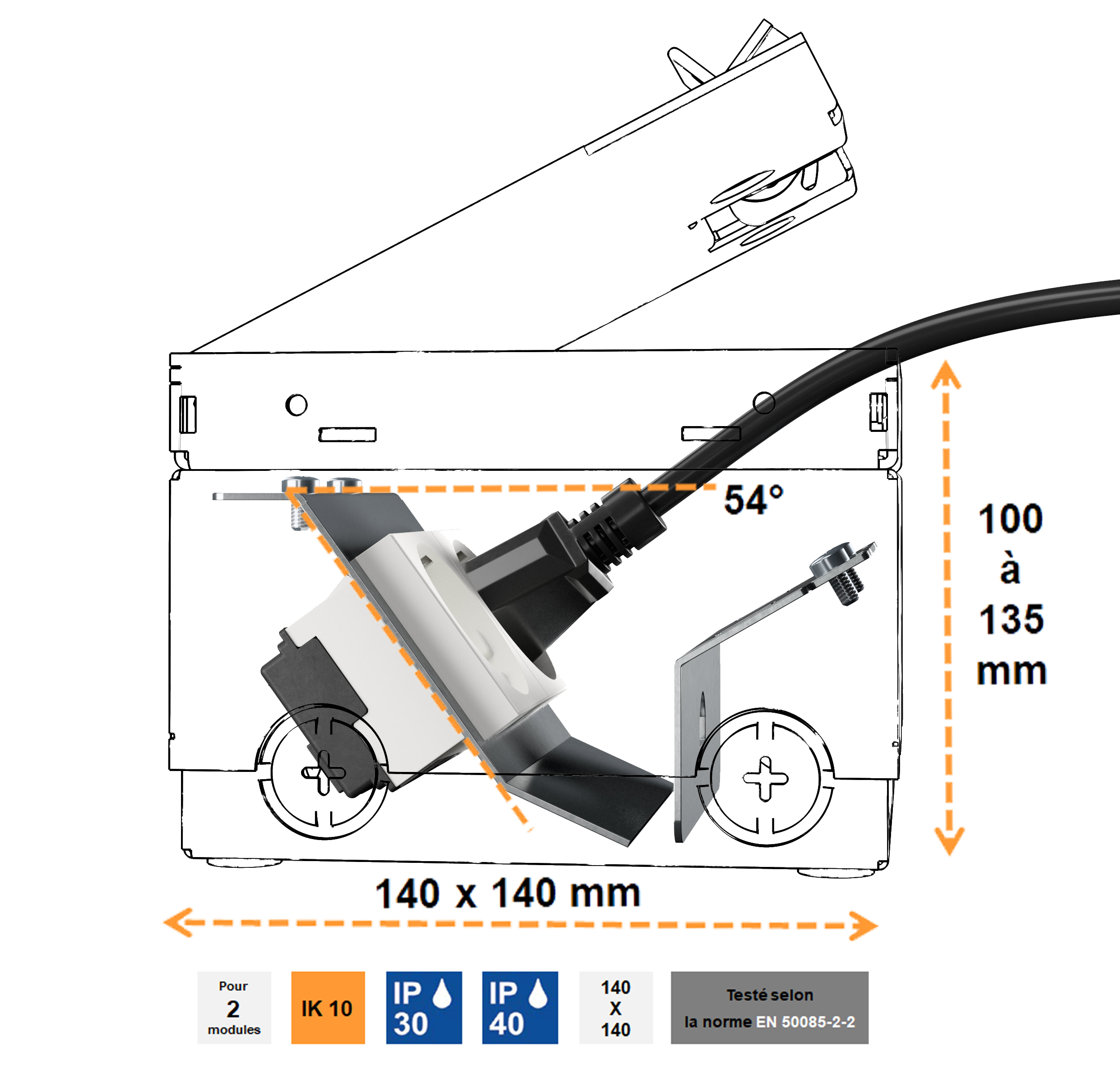 Le boîtier de sol compact UDHOME2 permet l’installation de deux prises 45x45 et deux RJ45. Celles-ci sont inclinées à un angle de 54° facilitant ainsi le branchement de tous types de prises (droites, coudées, chargeurs) et permettant de les faire disparaître sous le couvercle sans plier le câble. Il est petit mais très robuste avec sa résistance aux chocs IK10. Le boîtier peut être ajusté selon la profondeur de chape (100-135mm) pour arriver affleurant au sol.