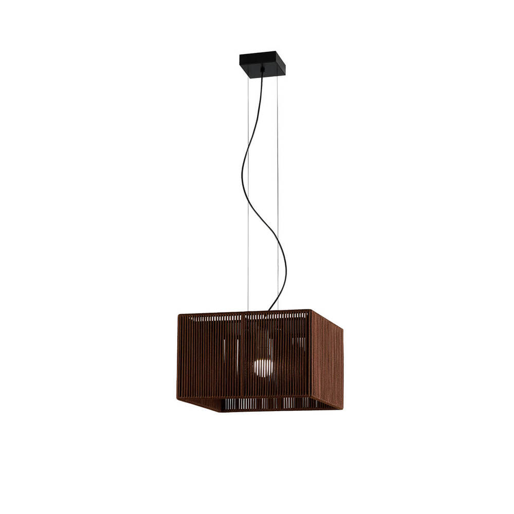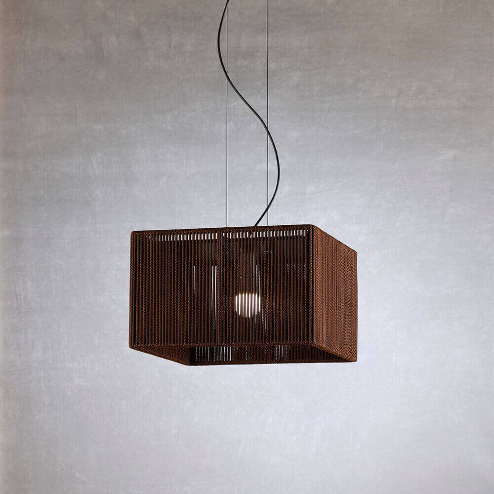 Lampe à suspension durable de forme cubique avec un abat-jour en cordon tressé à la main fabriqué à partir de bouteilles en plastique recyclées, disponible dans une large gamme de couleurs.
