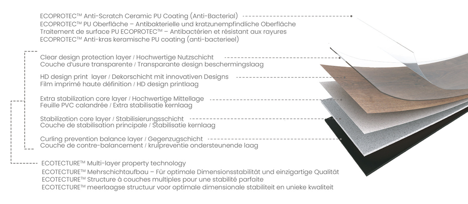 Epaisseur 2,0 mm. Couche d’usure : 0,30 mm Taille des lames : 228,6 x 1524 mm (14 lames / boîte = 4,87m²)