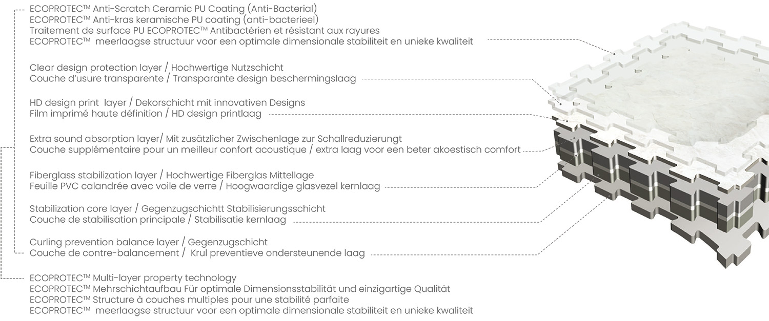 Ce revêtement de sol offre une durabilité exceptionnelle et un entretien facile grace à son traitement de surface antibactérien ECOPROTEC™, ce qui le rend idéal pour les bureaux, les salles de sport, les hôtels et les projets de rénovation rapide.