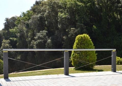 Dotés de câbles en acier qui unissent leurs supports afin de renforcer leur effet de séparation des espaces, les gardes-corps Angle Line peuvent arborder des rampes en bois tropical ou en acier inoxydable.