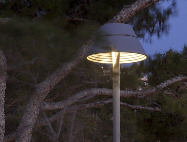 Le lampadaire urbain INTER se démarque par son look innovant qui s’inspire des luminaires domestiques avec son abat-jour et ses couleurs claires.