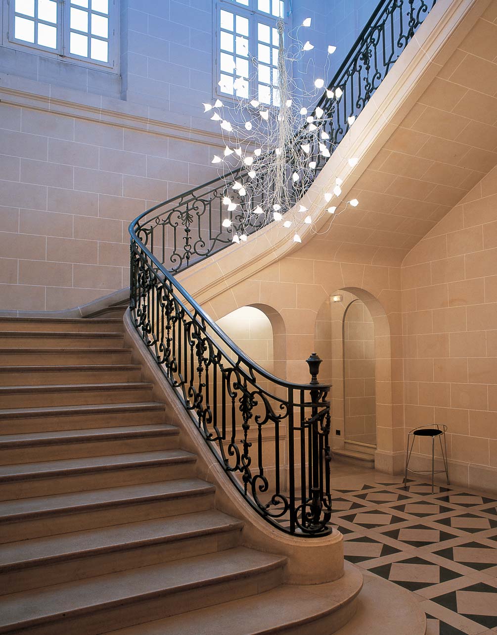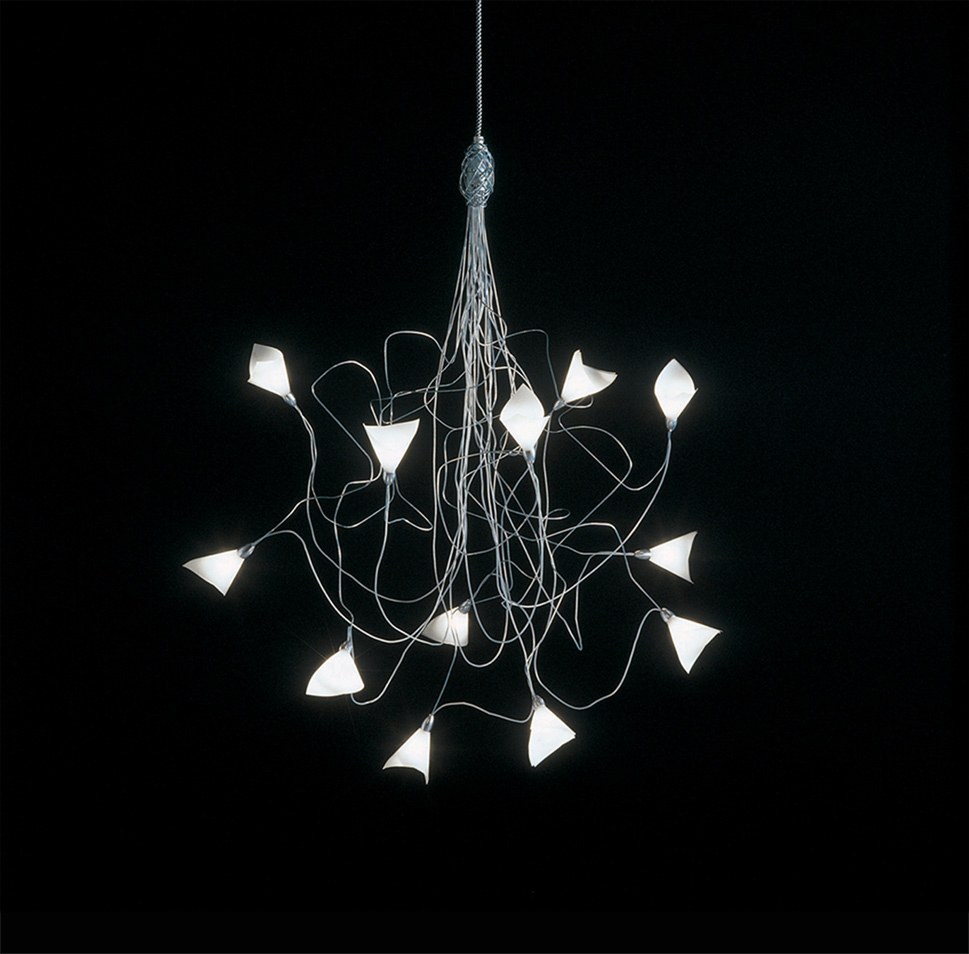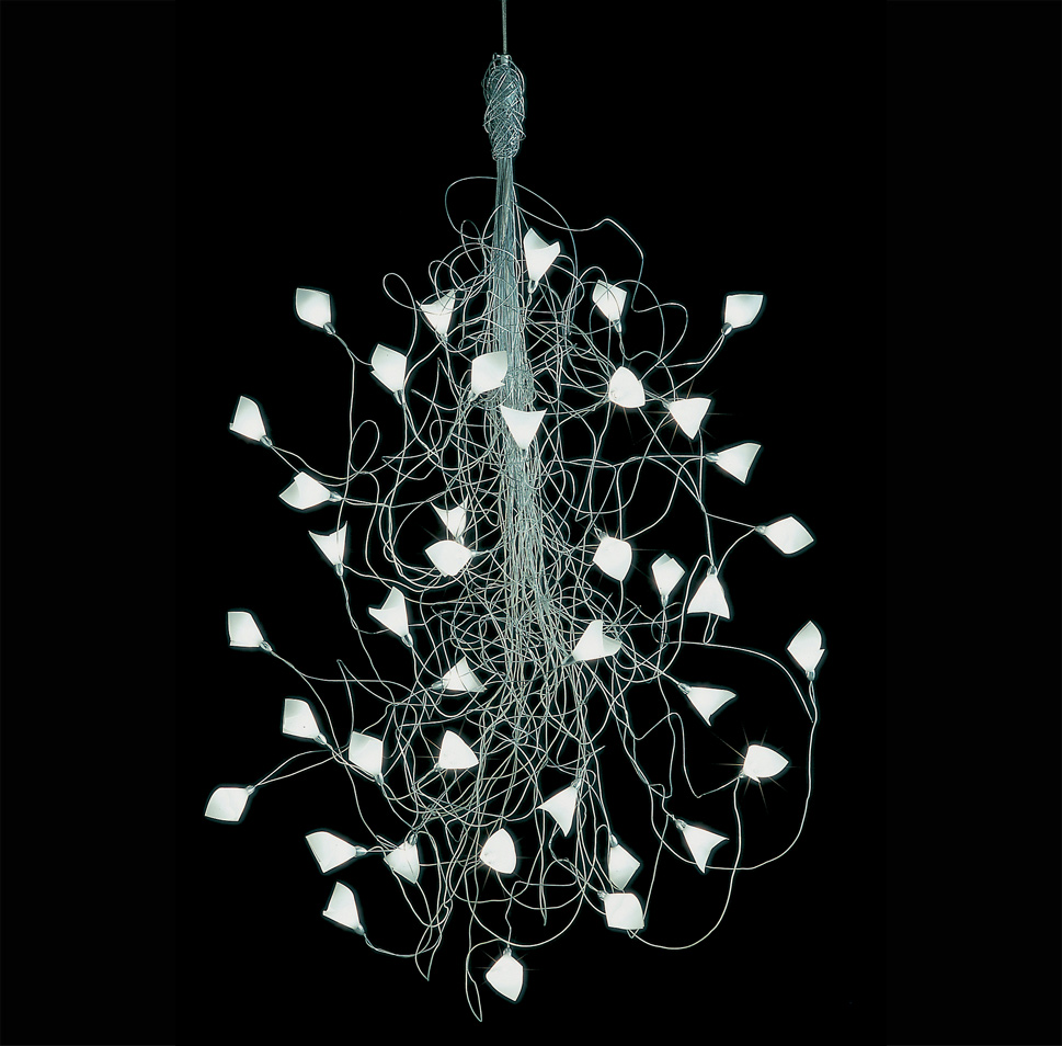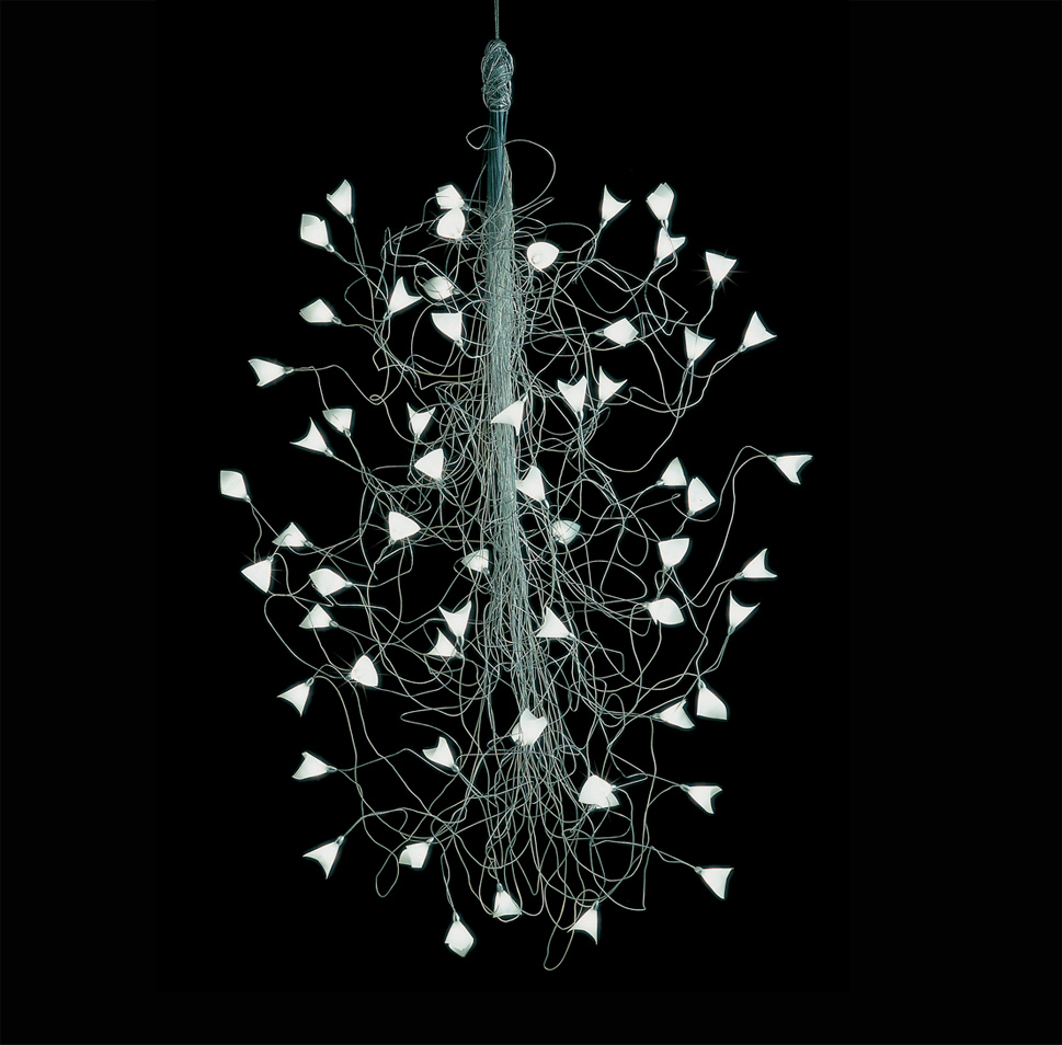Installation : en suspension. Dimensions : de ~900x900mm pour 12 flammes à ~2000x1300mm pour 60 flammes. Câble d’alimentation longueur 1500mm. Sources : LED IRC>80 et IRC>90. Températures de couleur : 2700°K, 3000°K, 4000°K. Finitions : filin semi-rigide en acier zingué ou noir. Filin souple transparent, autres couleurs sur demande. Patère : gris argent, blanc, noir. Câble d’alimentation transparent, autres couleurs sur demande. Diffuseurs : polycarbonate dépoli. Alimentation : on/off. Sur demande : DALI, Touch-Dim, DMX, WiFi. Indice de protection : IP20. Garantie : 5 ans.