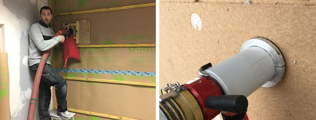 L’insufflation nécessite une attention particulière à la conception de la paroi, car la ouate est recompactée dans des caissons fermés : murs, rampants, planchers, doublages, … Une buse est alors nécessaire pour remplir à haute densité. La densité minimale requise est de 55 kg/m3 pour garantir un remplissage parfait du volume et l’absence de tassement dans le temps. Pour plus de détails concernant l’insufflation de la ouate de cellulose dans les murs à ossature bois, vous pouvez consulter notre article.
