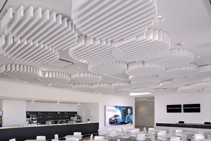 Lamelles de forme arrondie ressemblant à un nuage. Dans un groupe, décalées en hauteur, les lamelles s’entrecroisent pour créer d’attrayants effets d’optique. Un design de plafond dynamique placé sous des plafonds à activation thermique qui continue d’assurer la même optimisation acoustique. Le kit lumineux LED Cloud, disponible en option, crée de beaux effets lumineux qui donne une ambiance agréable dans la pièce.