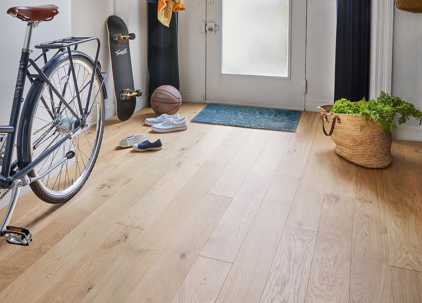 Grand Trafic est une gamme de parquets en chêne dédiés aux lieux de grande affluence. Idéal dans une entrée, le vernis mat ‘Bois Flotté’ offre, au bois, un aspect brut, intemporel et lumineux, aux lames choisies pour leur résistance accrue à l’abrasion.